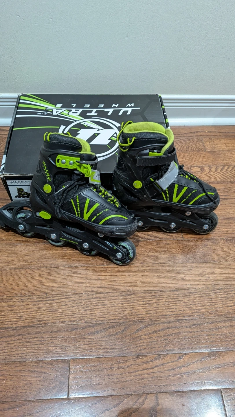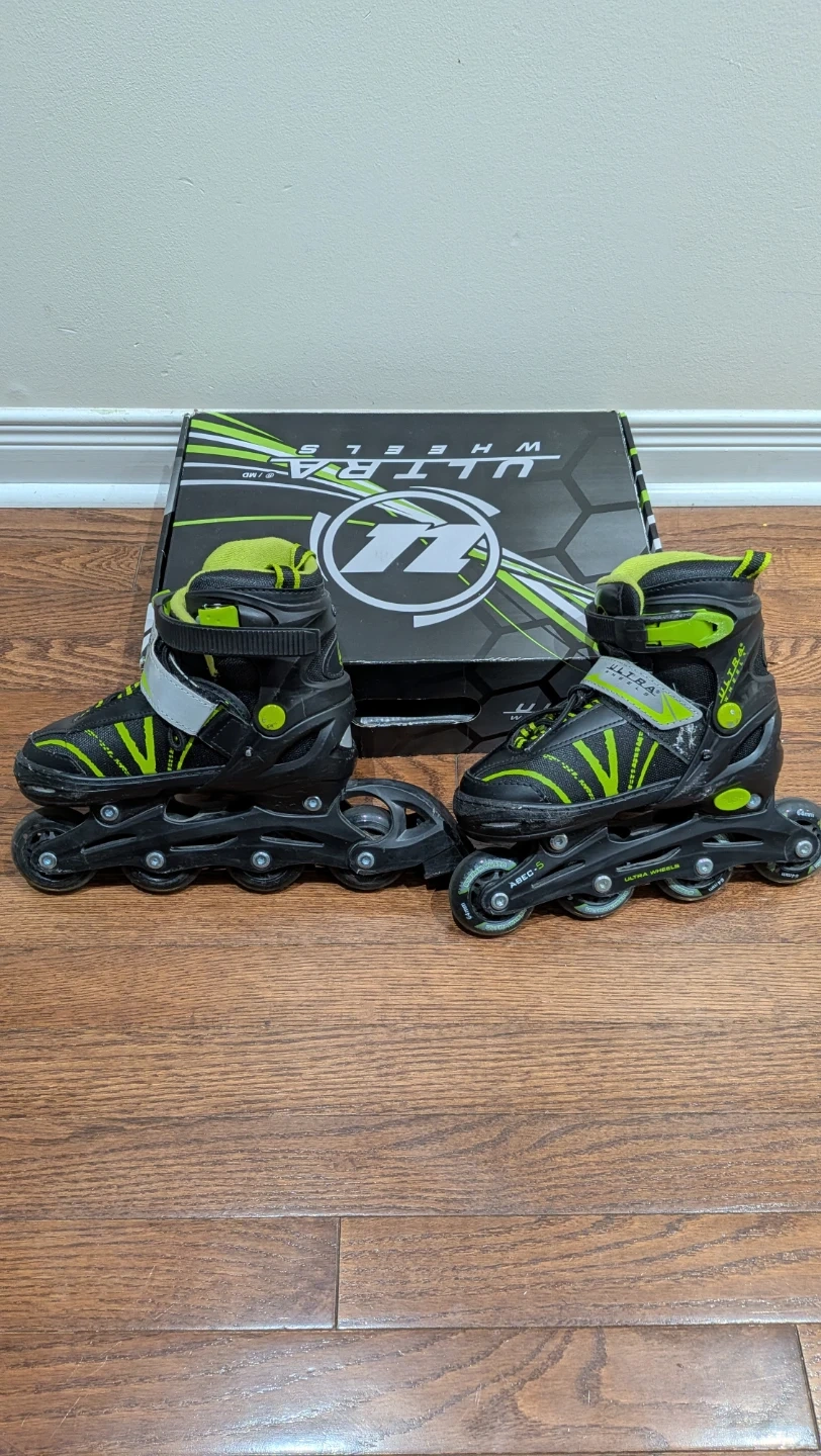 These black and green Ultra Wheels roller skates are adjustable for sizes 1 through 4. They come with the original box. Great for kids learning to skate!