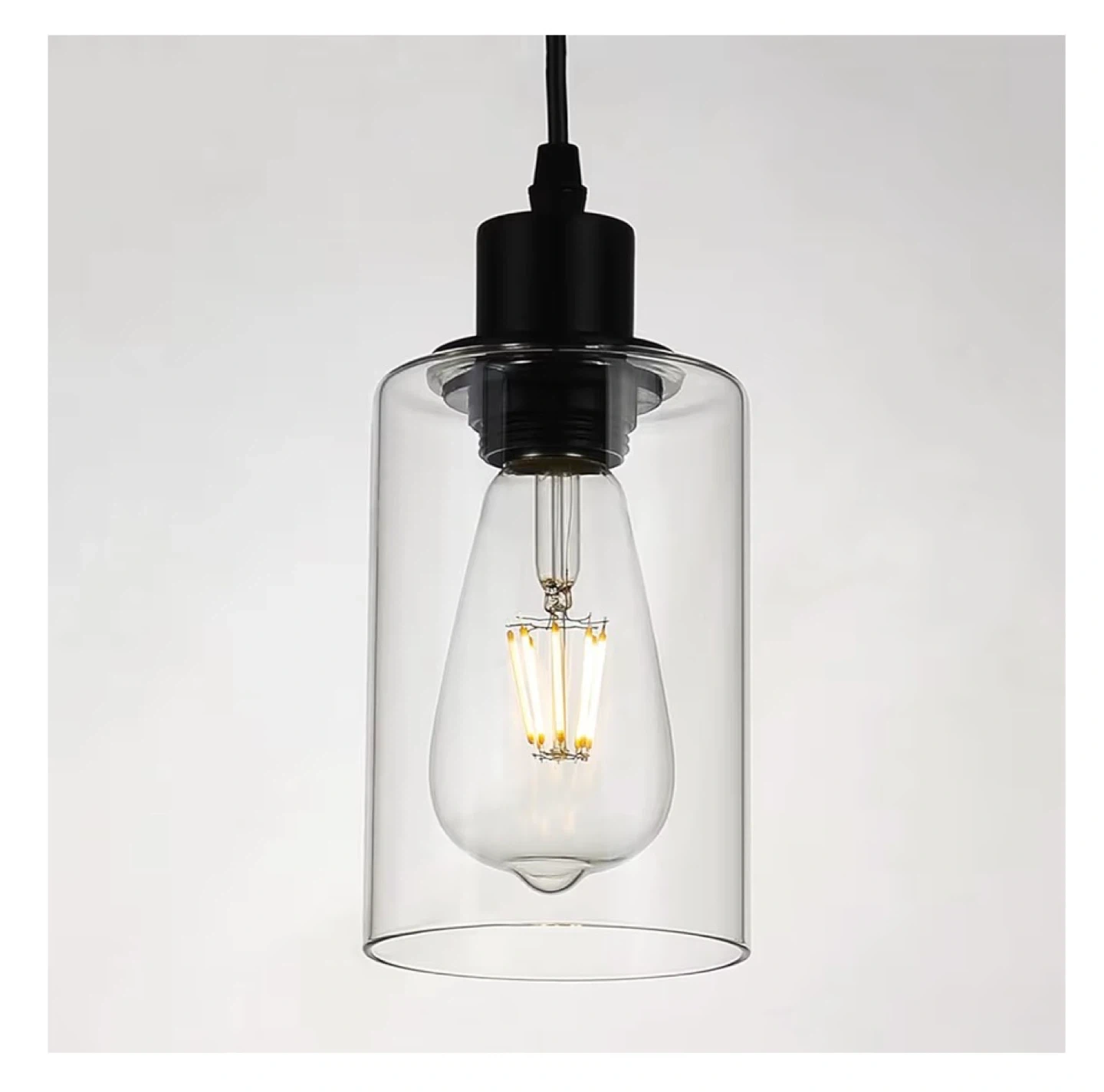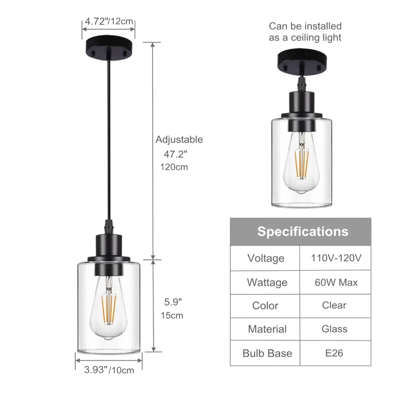 This is a 2-pack of pendant light fixtures. Each fixture has a clear glass shade and black hardware. The cord is adjustable up to 47.2 inches. The bulb base is E26 and takes up to a 60W max bulb. They're suitable for 110V-120V.