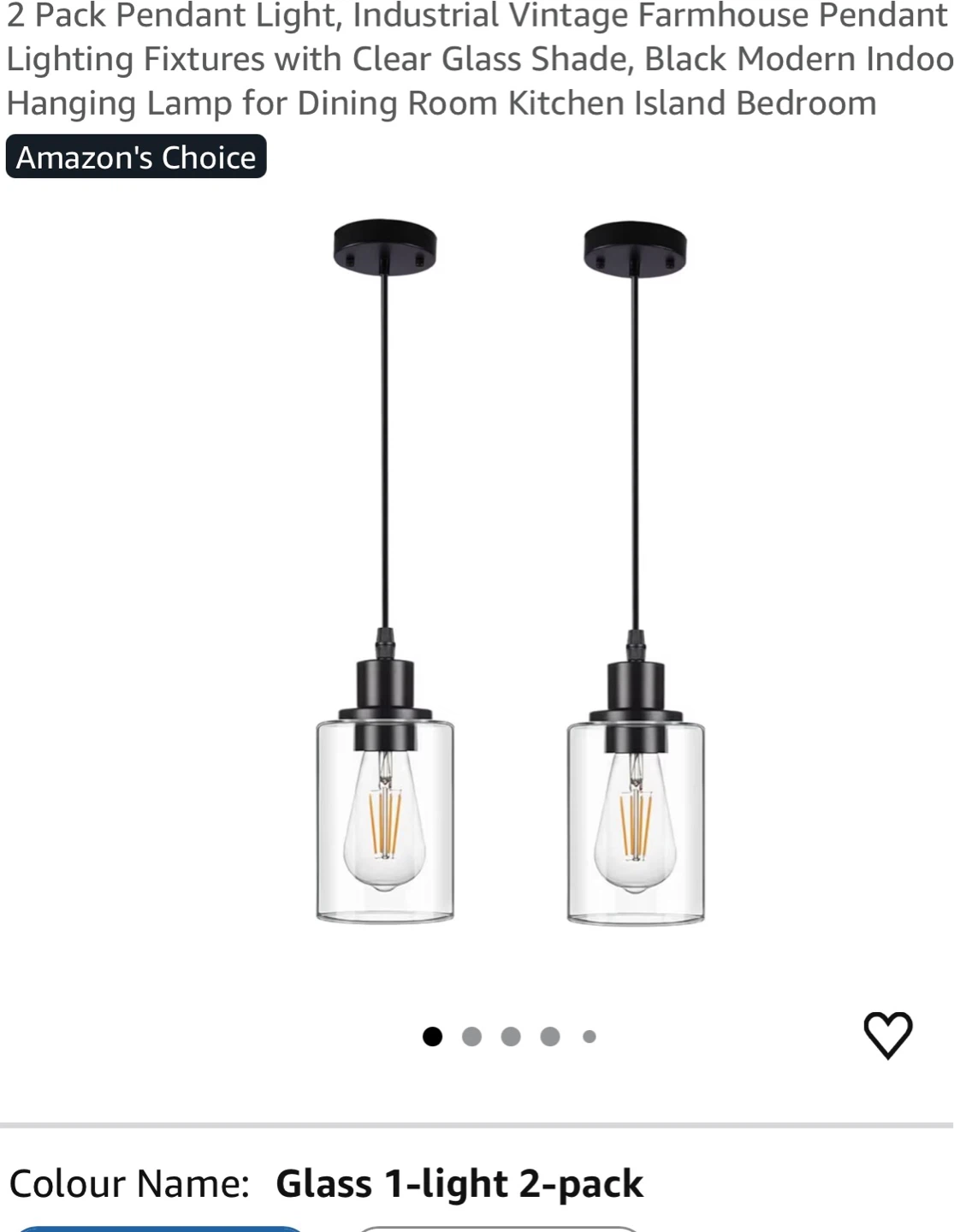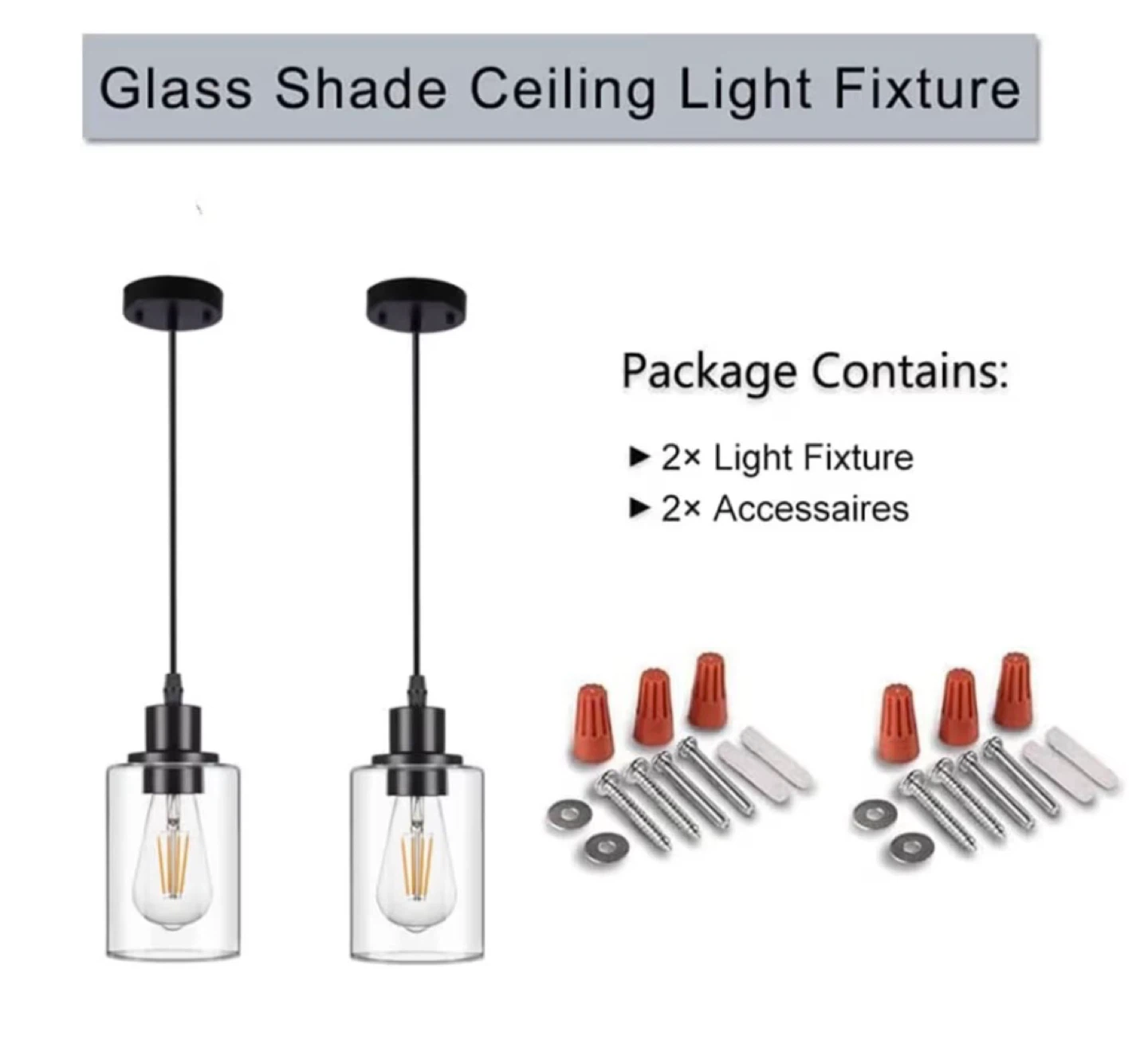 This is a 2-pack of pendant light fixtures. Each fixture has a clear glass shade and black hardware. The cord is adjustable up to 47.2 inches. The bulb base is E26 and takes up to a 60W max bulb. They're suitable for 110V-120V.