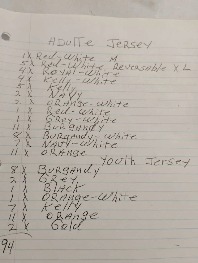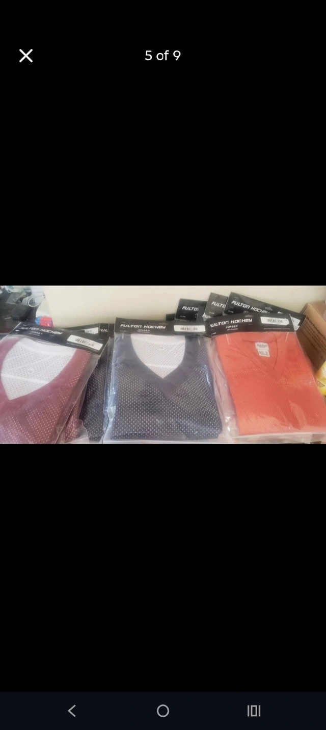 Up for sale we have some Brand New Fulton Adult Practice Jersey in different color asking $ 15 EACH up for sale we have some Brand New Fulton Reversible Youth and Adult Practice Jersey in different color 94 OF THEM asking $ 15 EACH OR $5 EACH IF YOU TAKE THEM ALL pick up ON BEAVERBROOK LANE IN KANATA
