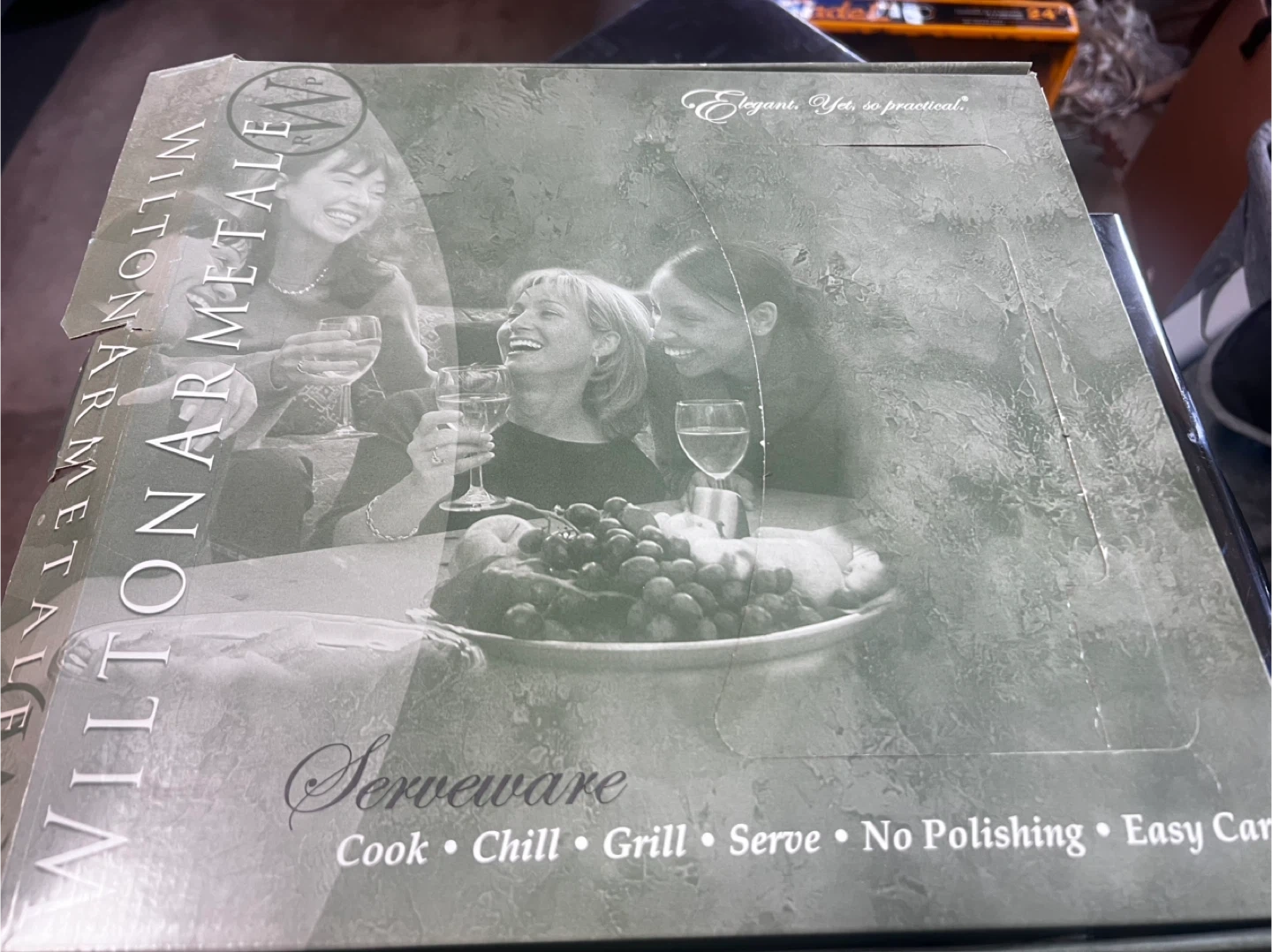 This Wilton Armetale serveware platter is elegant yet practical. It's made of a durable metal alloy with a decorative leaf border and a wooden centre. This piece is versatile for cooking, chilling, grilling, and serving.