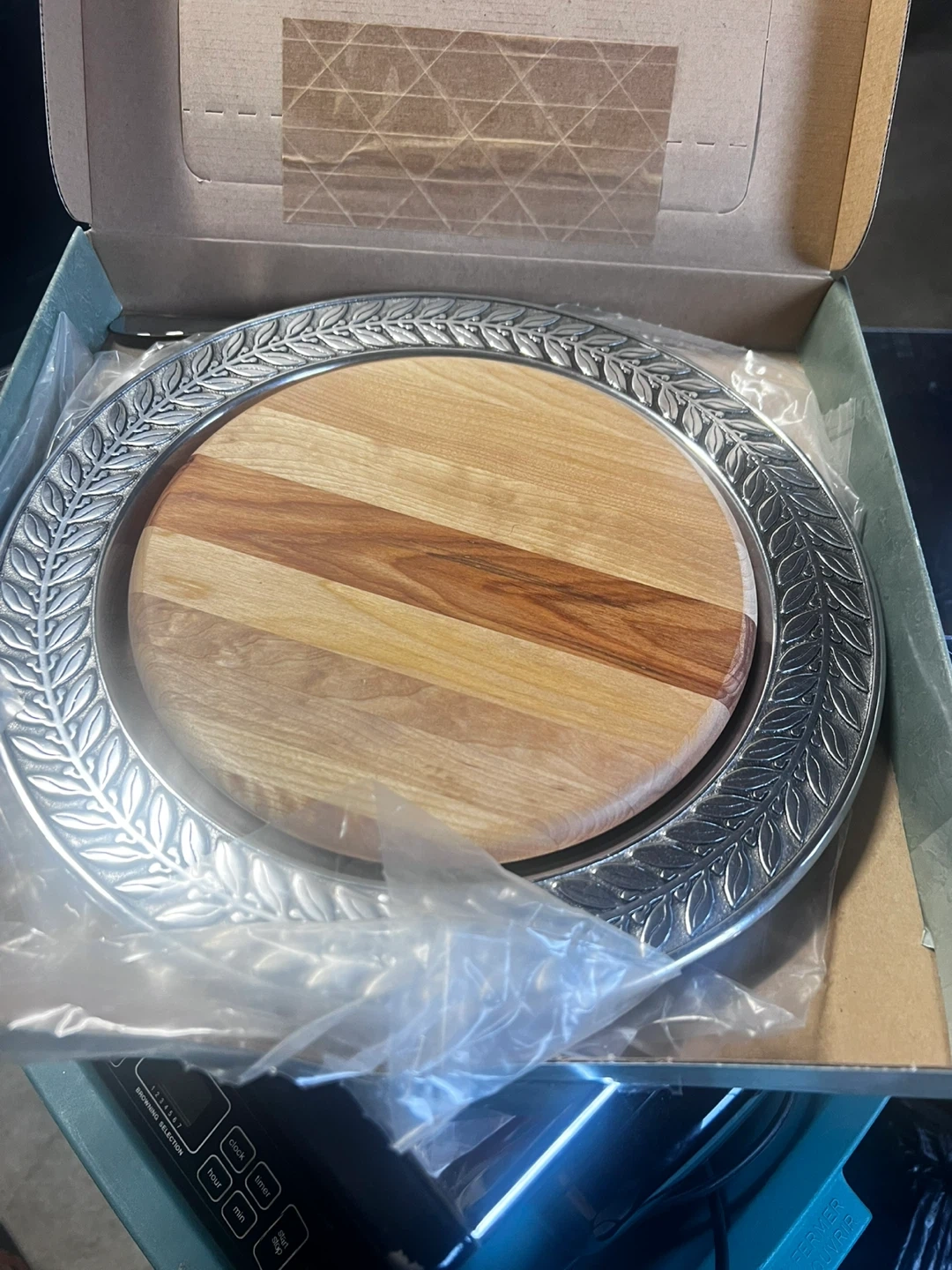 This Wilton Armetale serveware platter is elegant yet practical. It's made of a durable metal alloy with a decorative leaf border and a wooden centre. This piece is versatile for cooking, chilling, grilling, and serving.