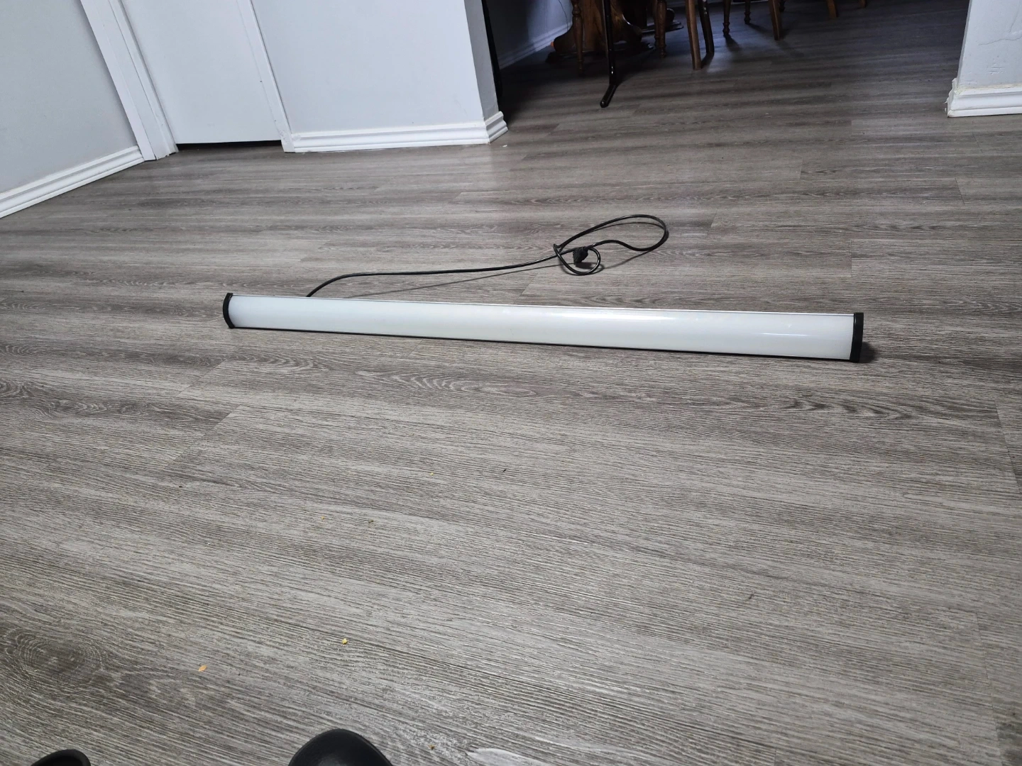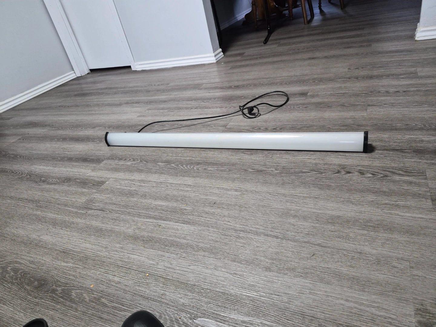 This is a linear fluorescent light fixture. It's white with black end caps. It comes with a power cord and plug. It's a good size for workspaces or garages.
