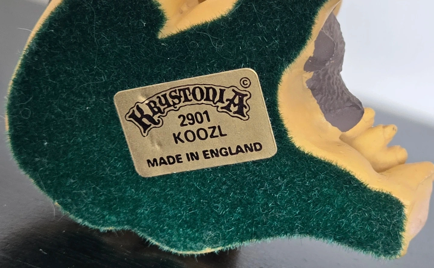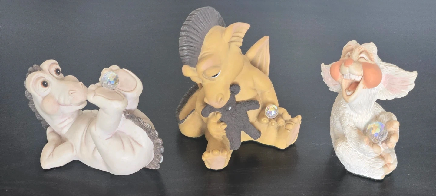 Beautiful Set Of 3 Authentic " World Of Krystonia" Collectable Figurines. These Whimsical Fantasy Characters Were Created in England By David Woodward and Pat Chandok. They are Made of Hand Painted Cold Cast Porcelain and Each Features a Genuine Swarovski Crystal. Includes Jumbly The Juggler 3411, Poffles 1401 and Koozl 2901. Year 1980's-90. 2 1/2"To 3 1/2" Height. These Pieces are all Retired and No Longer in Production. Asking $40 FIRM FOR ALL 3