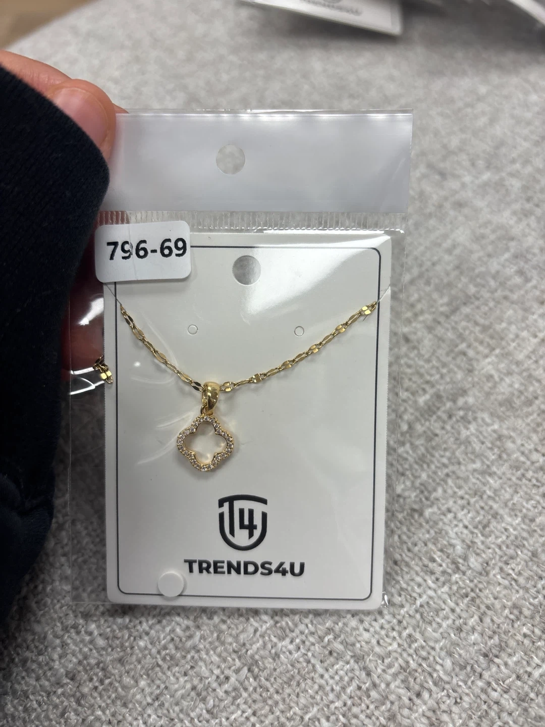 Stylish gold-tone necklace featuring a clover pendant adorned with small crystals. It's packaged and ready to wear or gift!