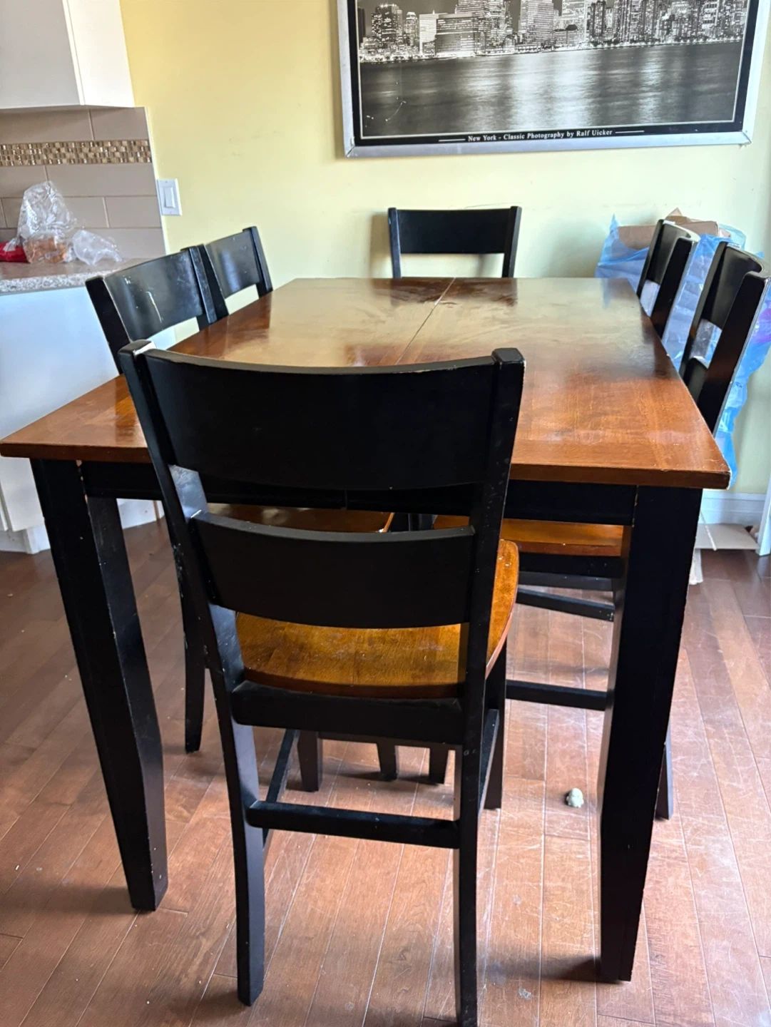 A two-toned dining set featuring a rich wood grain table top with black legs and matching chairs. This set includes one table and six chairs, perfect for family meals or entertaining guests. The table offers ample space for dining and conversation.