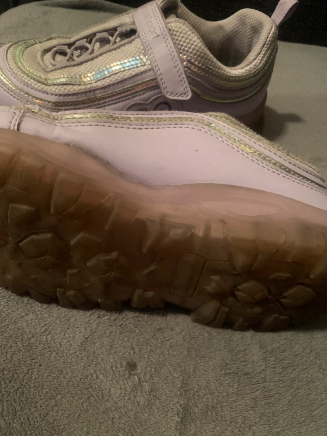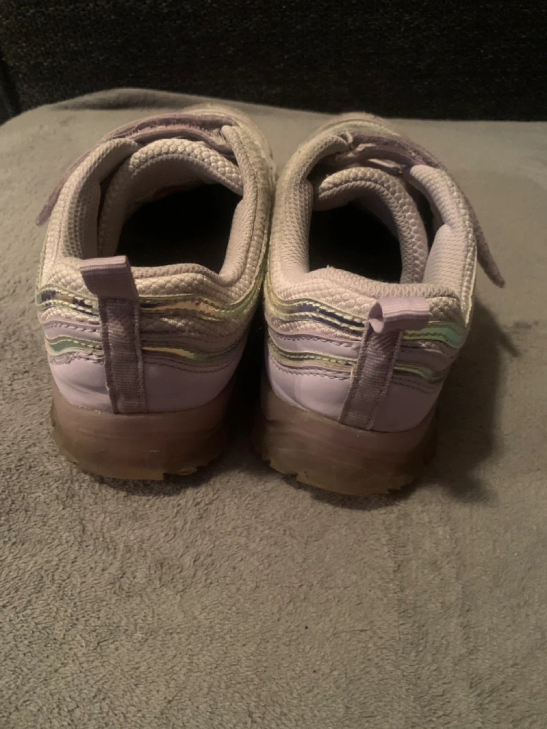 Light purple sneakers from Justice Sport. They feature adjustable velcro straps and decorative laces. The soles are a translucent rubber.