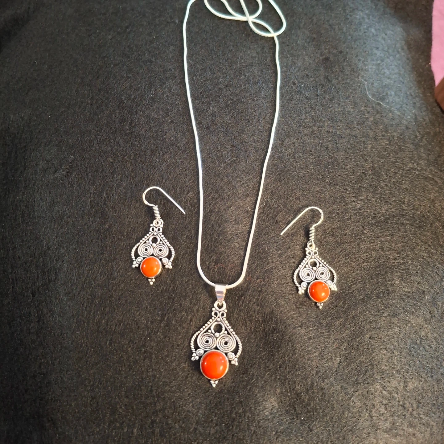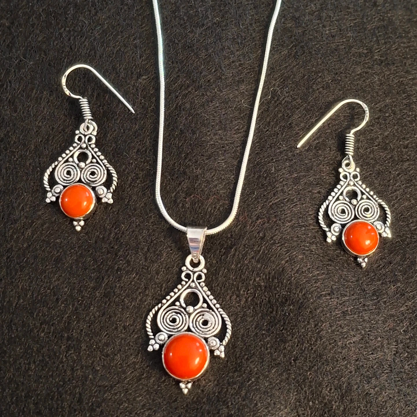 This jewelry set includes a pendant necklace and matching dangle earrings. The intricate sterling silver metalwork frames red coral gemstones. It's a lovely accessory for adding a pop of colour!