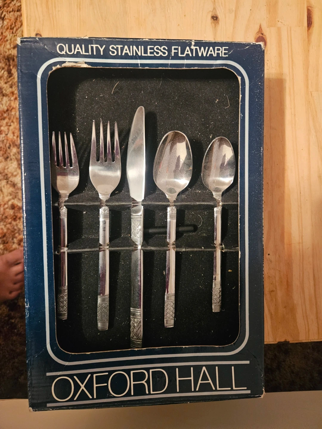 Quality stainless steel flatware from Oxford Hall. This set includes a fork, knife, and spoons. It's made from durable stainless steel with decorative handles. Great for everyday use!