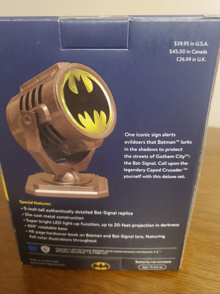 5 inch tall Bat signal replica. Bright Led light function up to 20 feet projection.