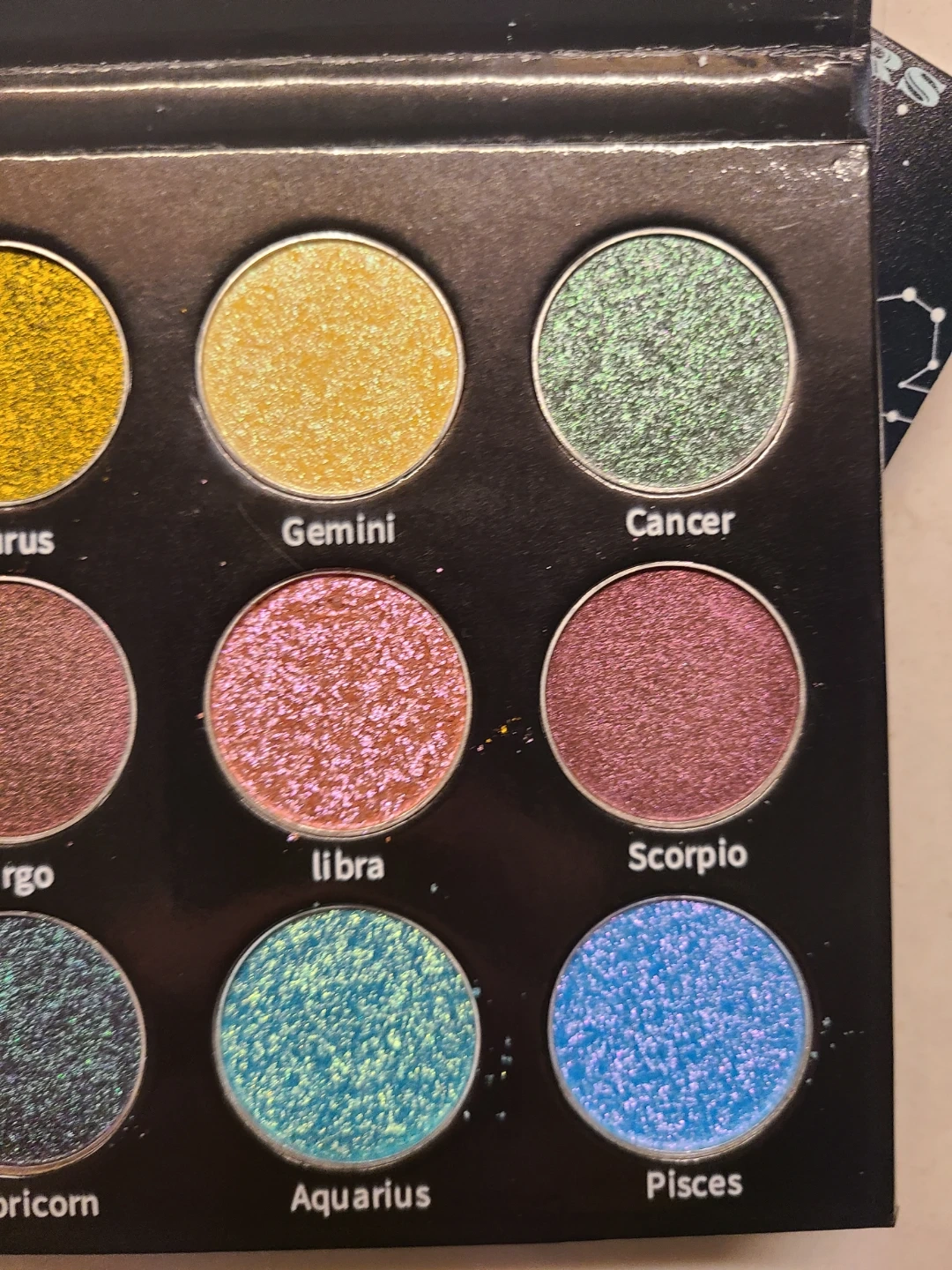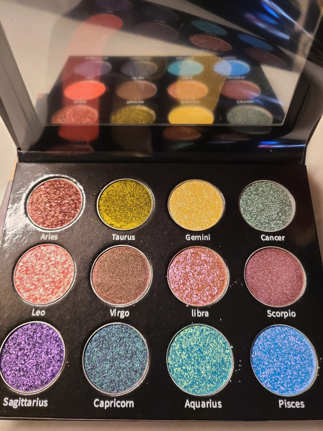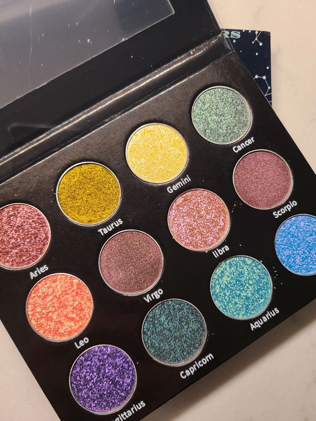 Saints Angels Sinners The Zodiac Signs. This eyeshadow palette features 12 shimmery shades inspired by zodiac signs. It includes colors like Aries, Taurus, Gemini, Cancer, Leo, Virgo, Libra, Scorpio, Sagittarius, Capricorn, Aquarius, and Pisces. The palette is cruelty-free!