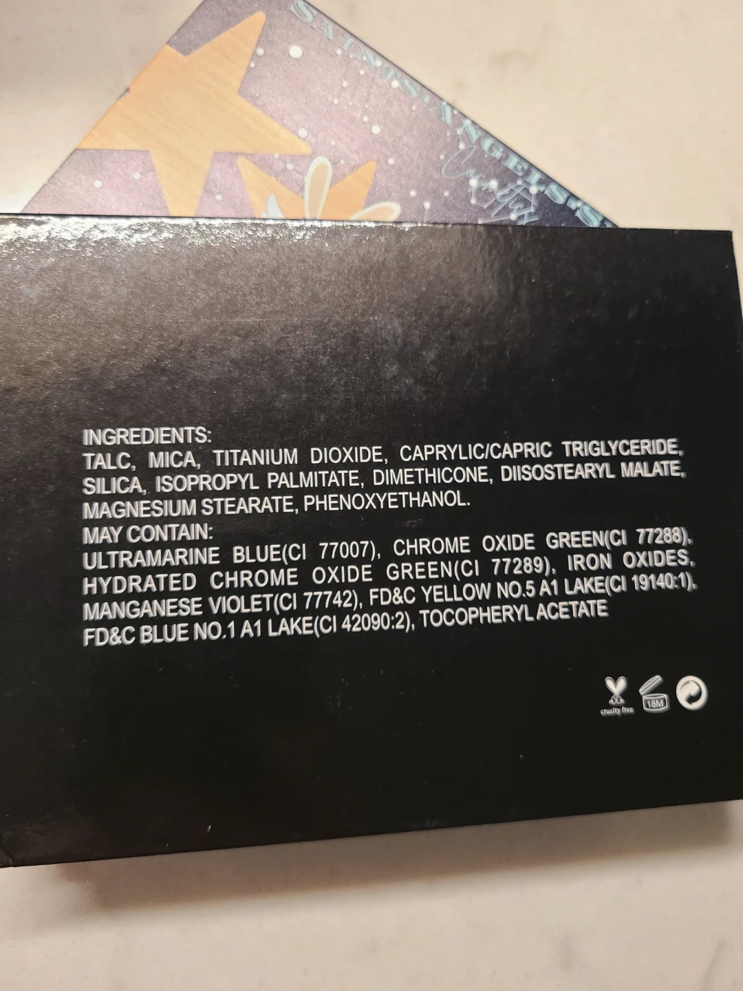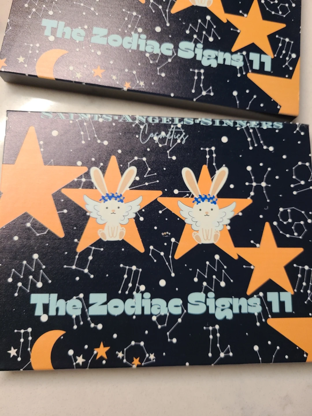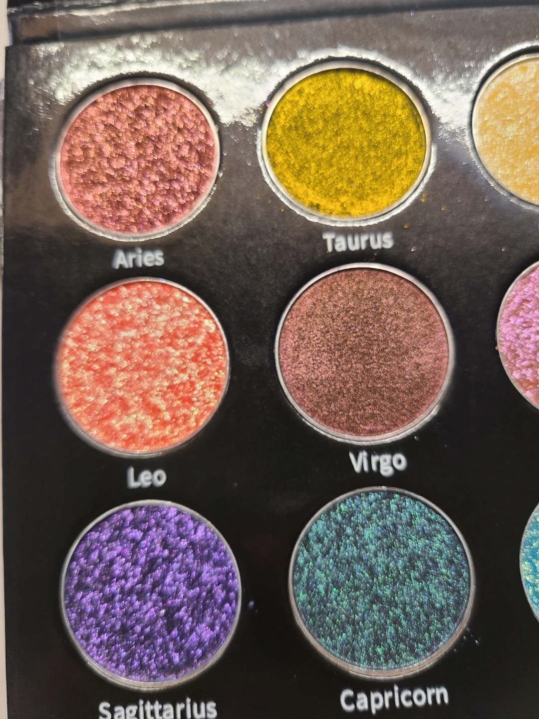 Saints Angels Sinners The Zodiac Signs. This eyeshadow palette features 12 shimmery shades inspired by zodiac signs. It includes colors like Aries, Taurus, Gemini, Cancer, Leo, Virgo, Libra, Scorpio, Sagittarius, Capricorn, Aquarius, and Pisces. The palette is cruelty-free!