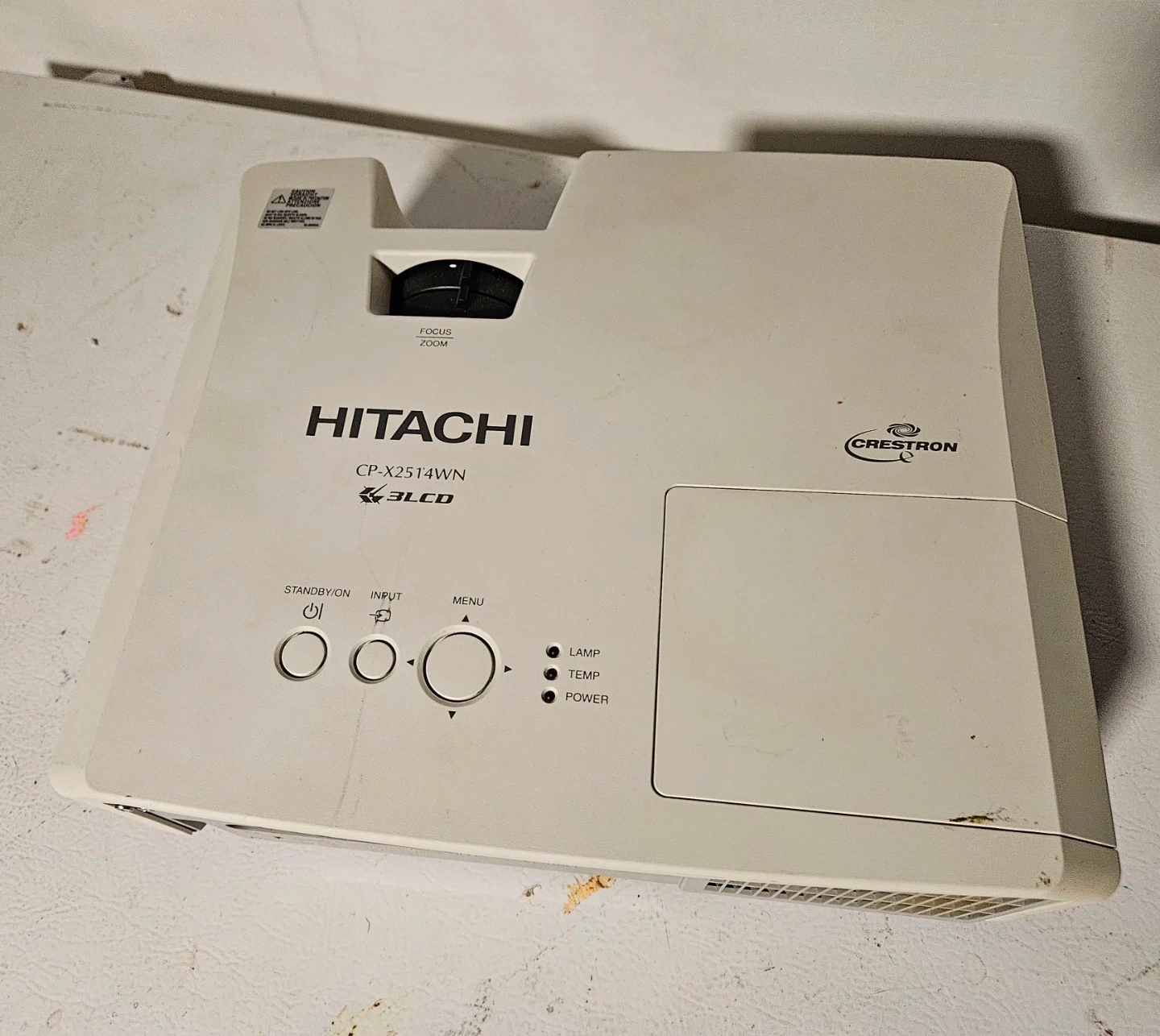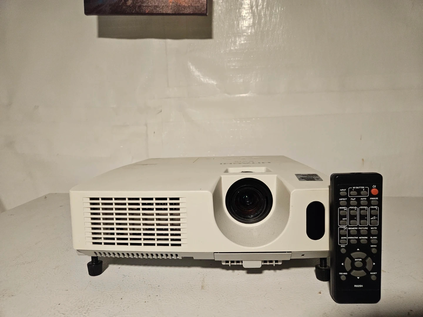 Hitachi CP-X2514WN projector. Includes original remote control. It's a reliable projector for presentations or home use. Features multiple input options, including HDMI and USB. Comes with attachment if you want to install it from the ceiling