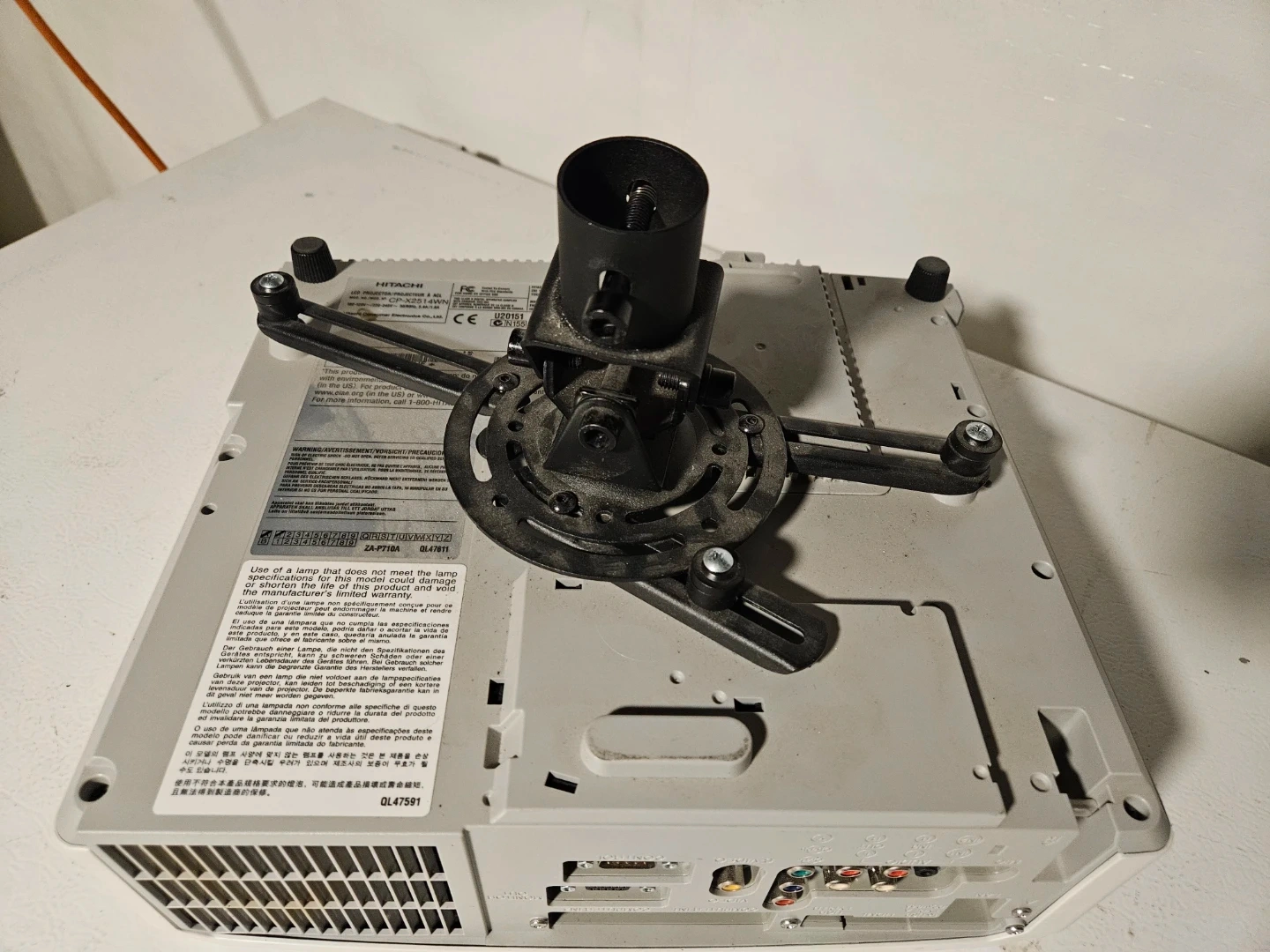 Hitachi CP-X2514WN projector. Includes original remote control. It's a reliable projector for presentations or home use. Features multiple input options, including HDMI and USB. Comes with attachment if you want to install it from the ceiling