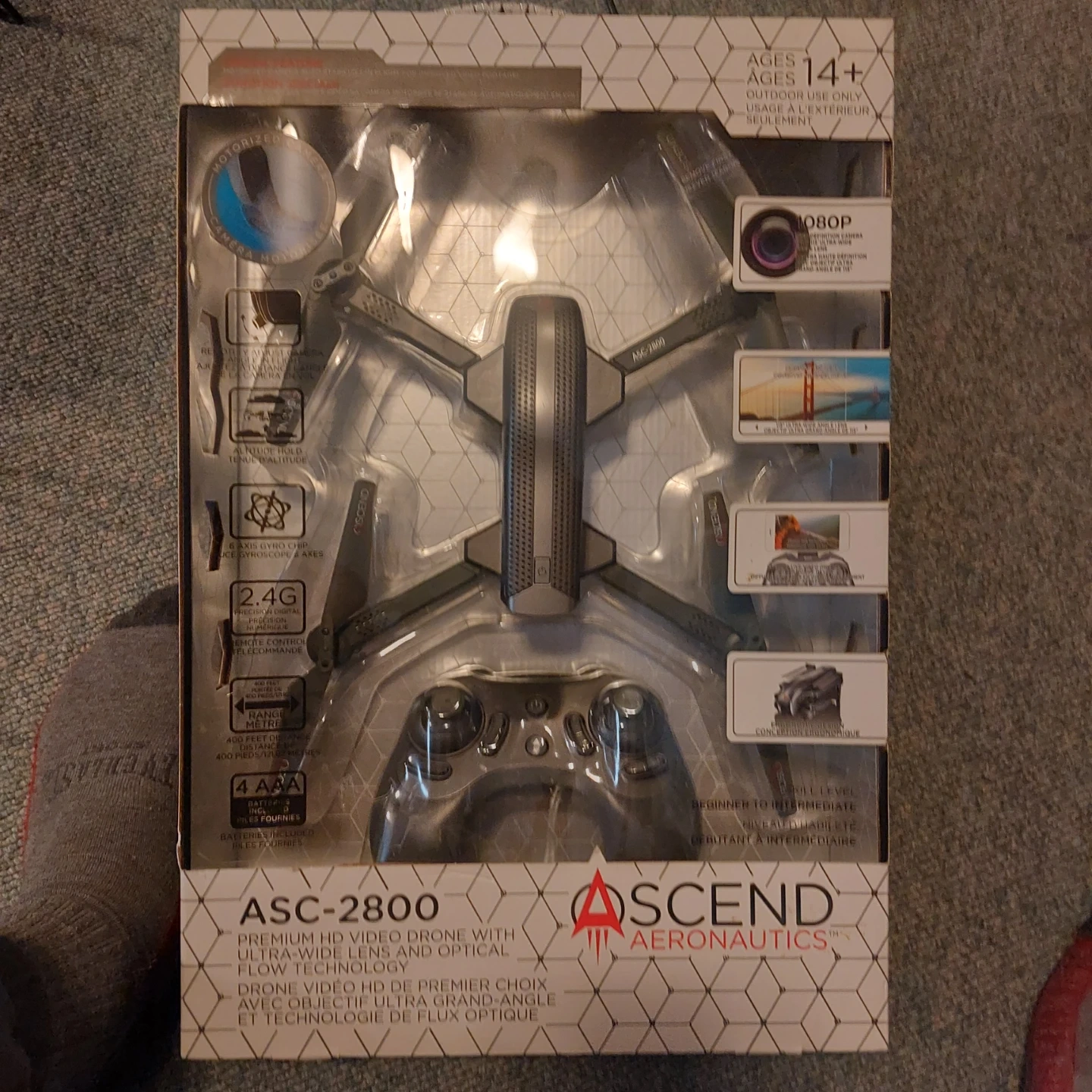 This Ascend Aeronautics ASC-2800 drone offers premium HD video with an ultra-wide lens and optical flow technology. It features a 1080p camera and a 2.4G remote control with a range of 400 feet. This drone is suitable for ages 14 and up.