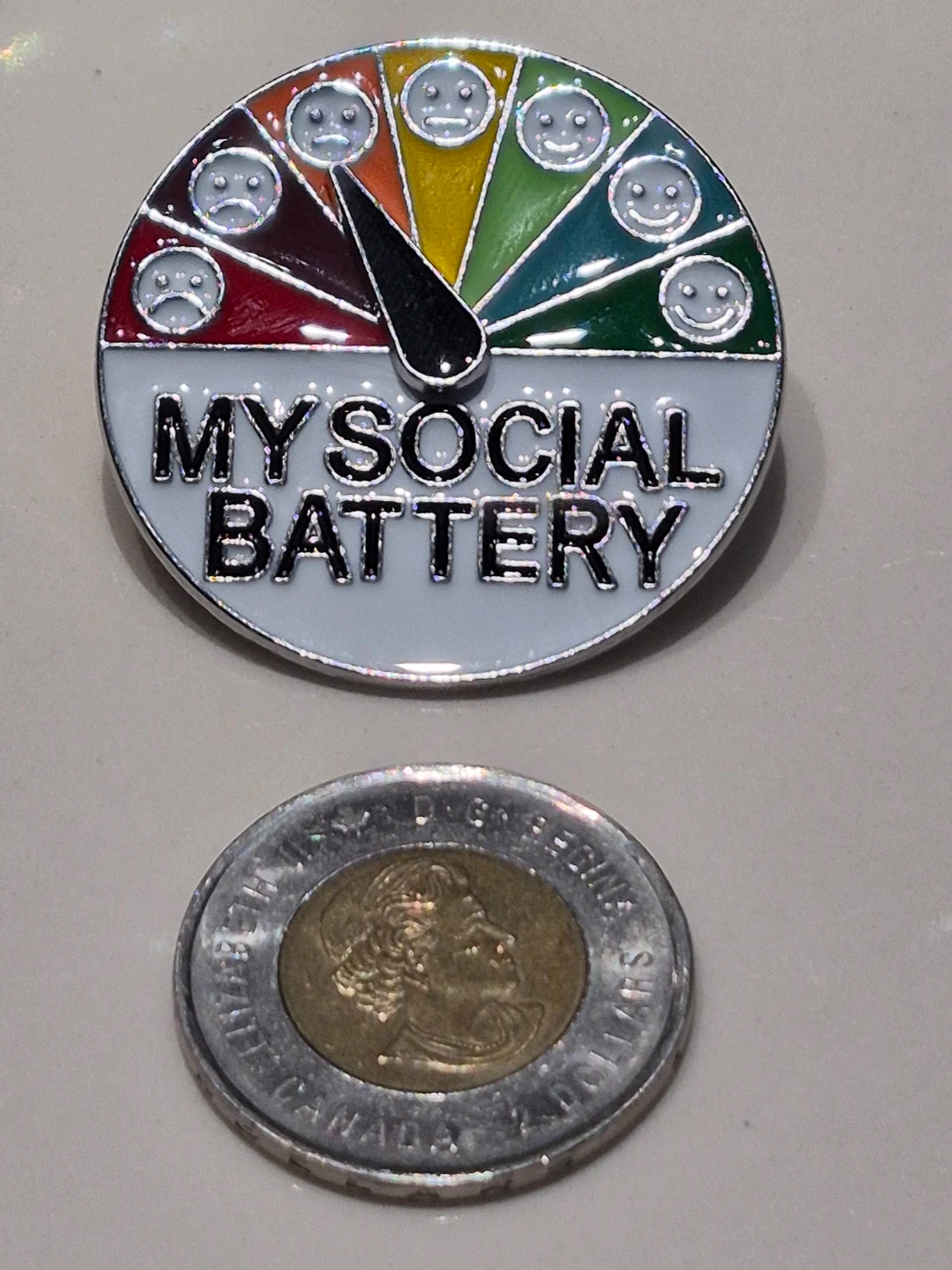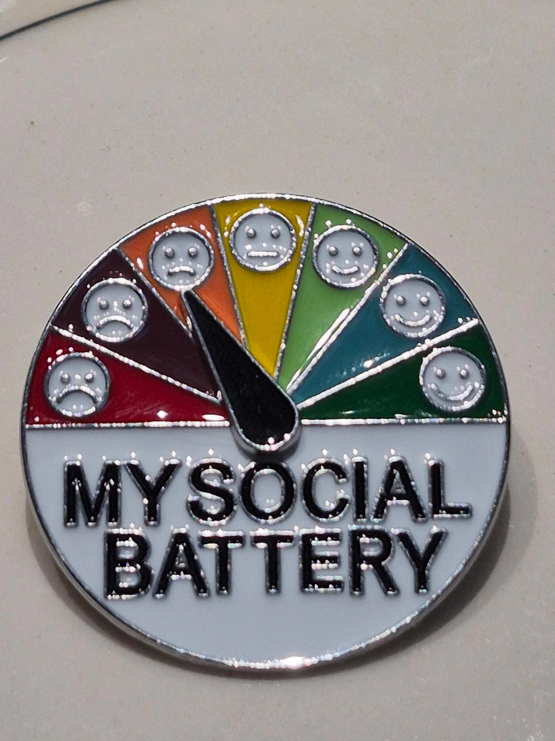 This is a fun pin that shows your current social energy level. It has a gauge with different facial expressions from sad to happy. This pin is great for expressing how you're feeling on any given day!