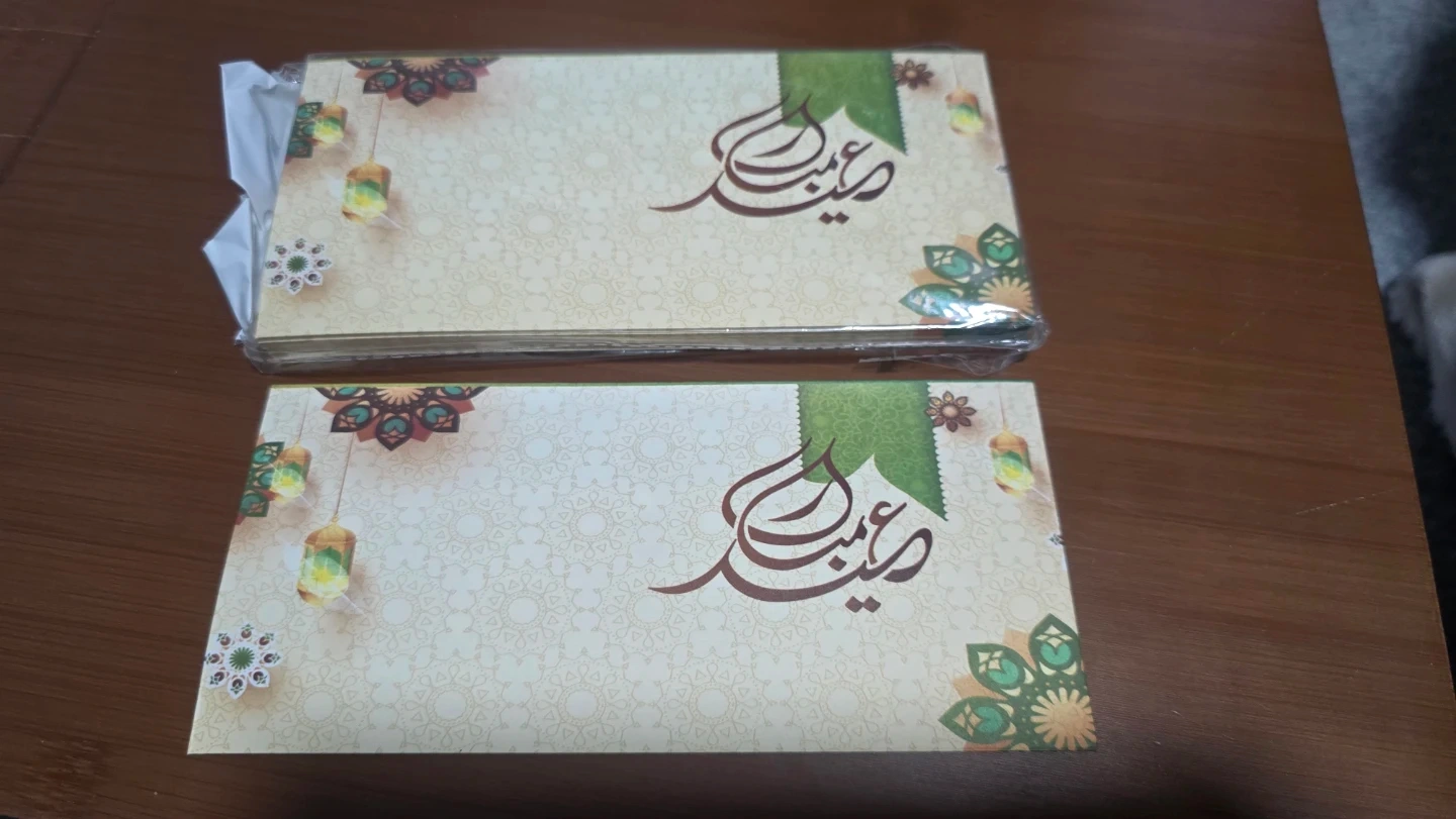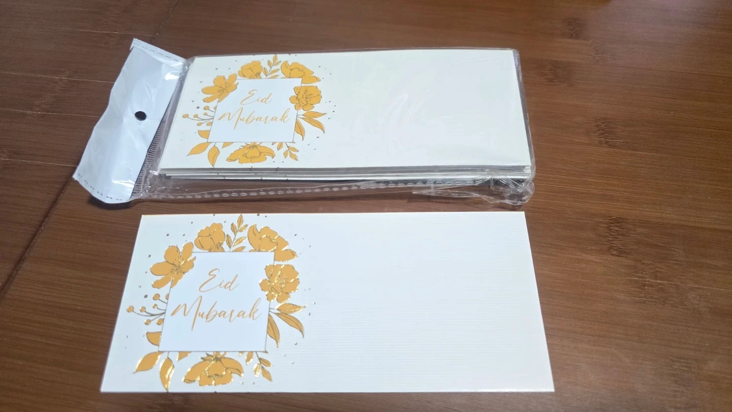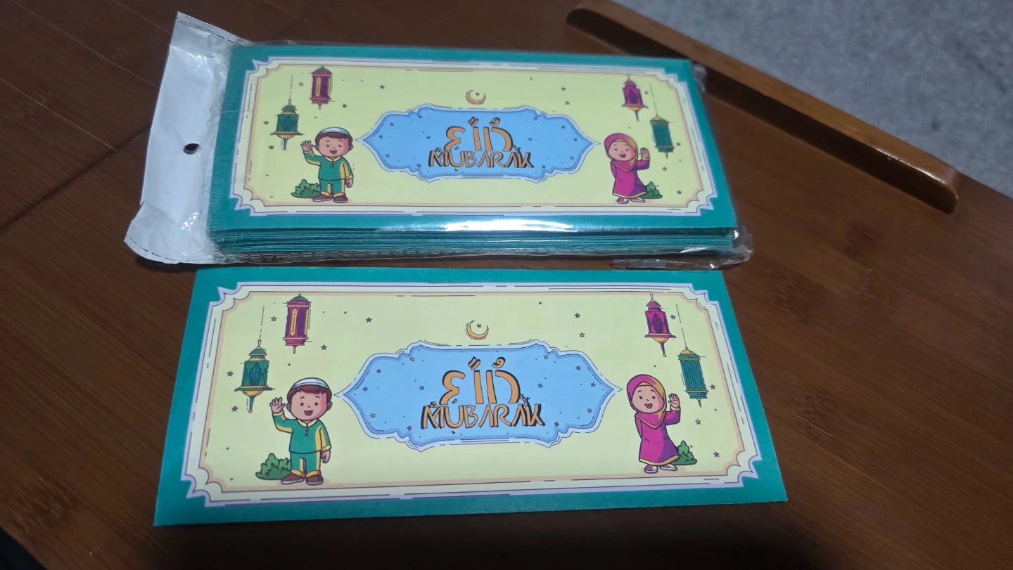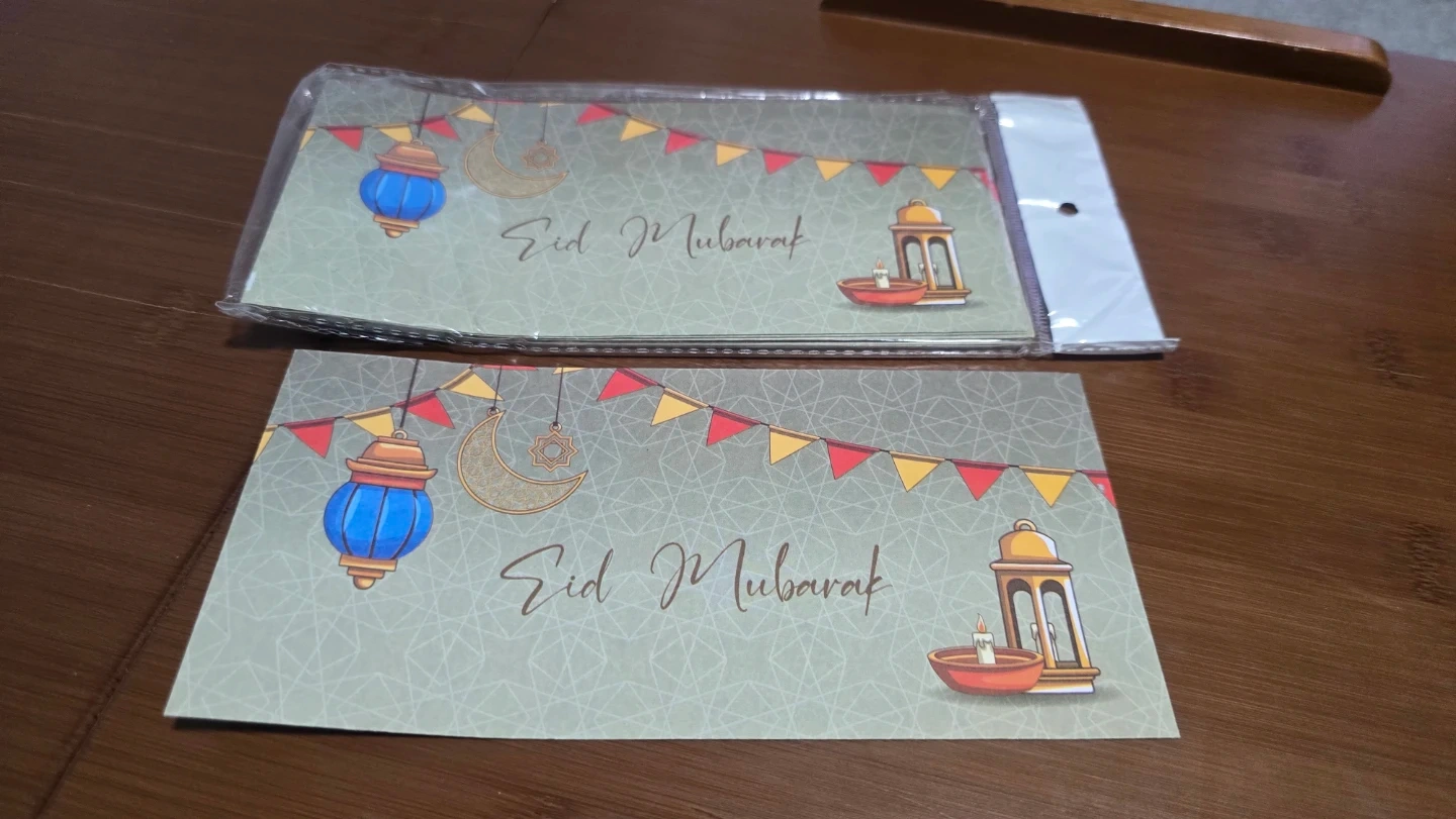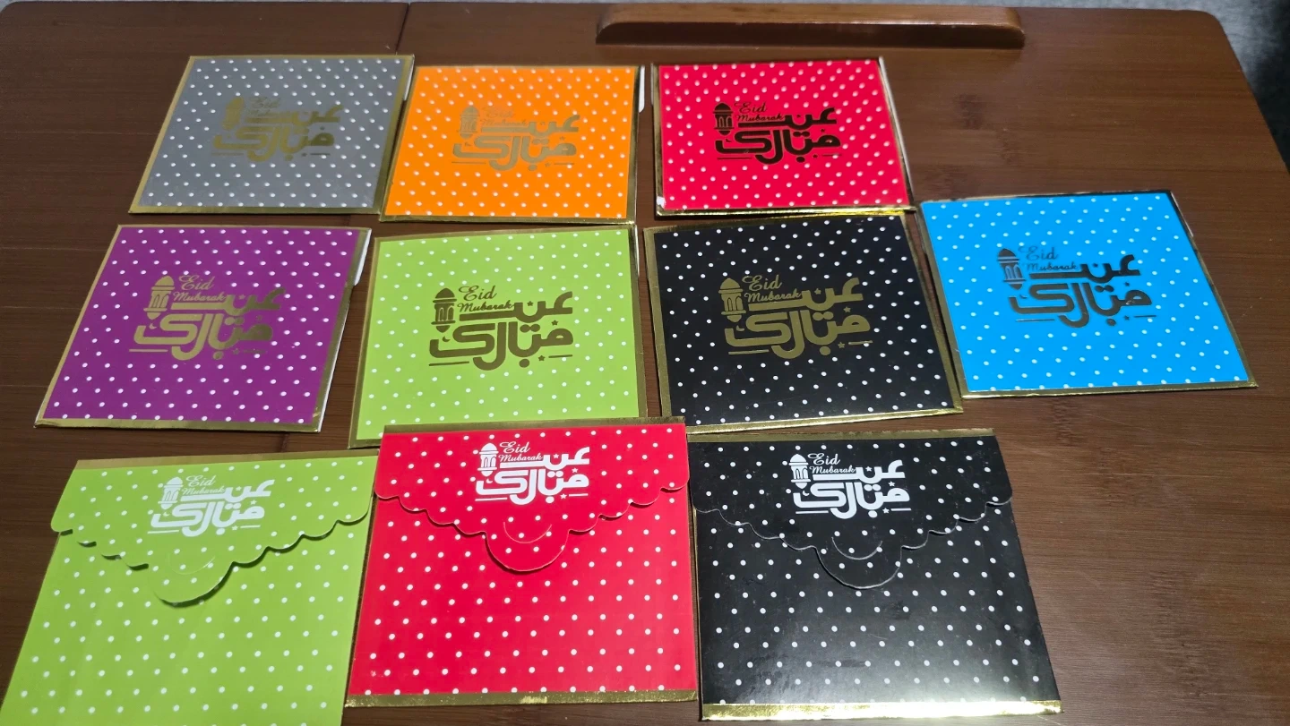 A set of envelopes designed for Eid Mubarak celebrations. Features various colourful patterns and festive graphics. Perfect for gifting cash or cards during Eid. Includes multiple designs to suit different preferences.