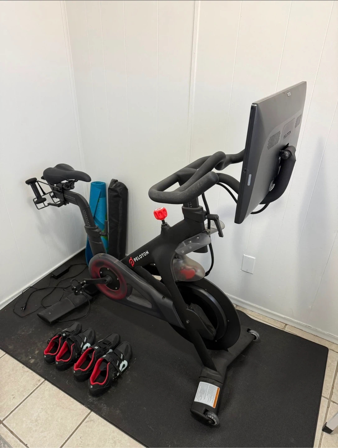 Peleton bike for sale - barely used, almost brand new condition. Works perfectly, even has the Netflix app on it. Comes with women’s shoes size 9 and men’s shoes size 12, also barely used, perfect condition.