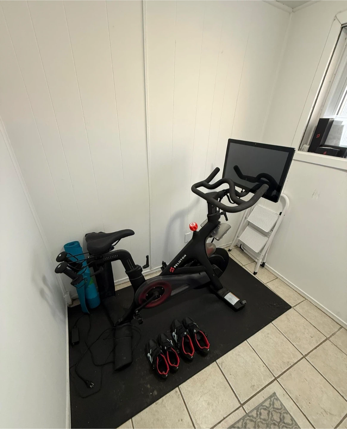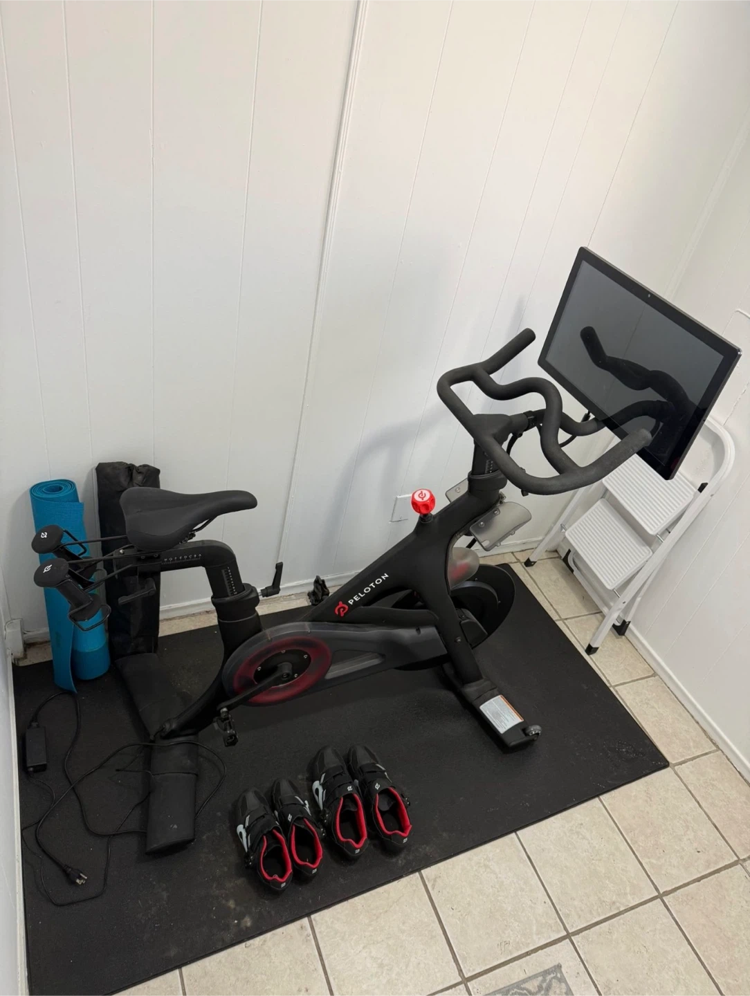 Peleton bike for sale - barely used, almost brand new condition. Works perfectly, even has the Netflix app on it. Comes with women’s shoes size 9 and men’s shoes size 12, also barely used, perfect condition.