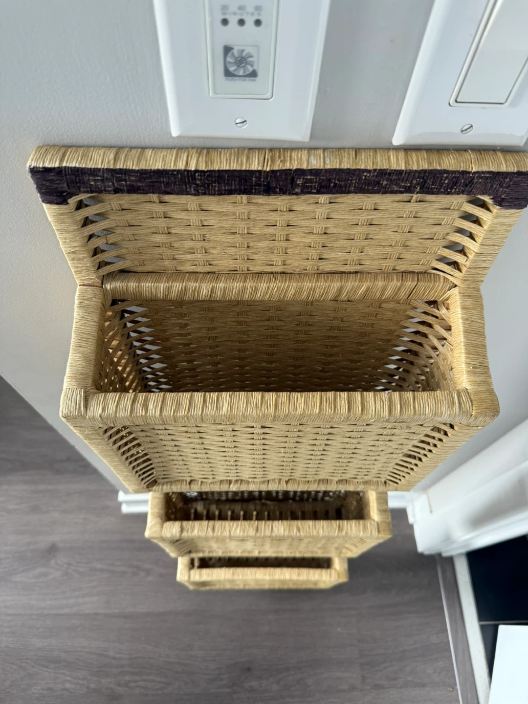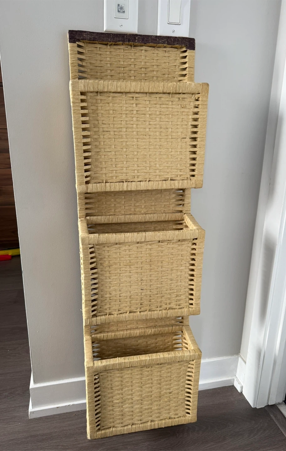 This hanging wall organizer features three woven pockets for storage. It's made from a natural woven material in a light tan color. The top trim is dark brown. This organizer is great for storing mail, magazines, or small items.