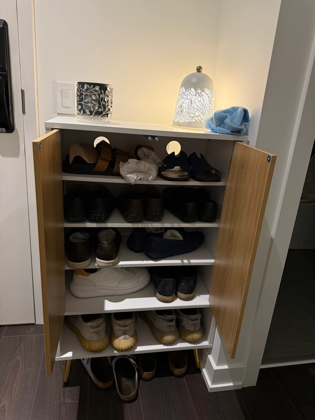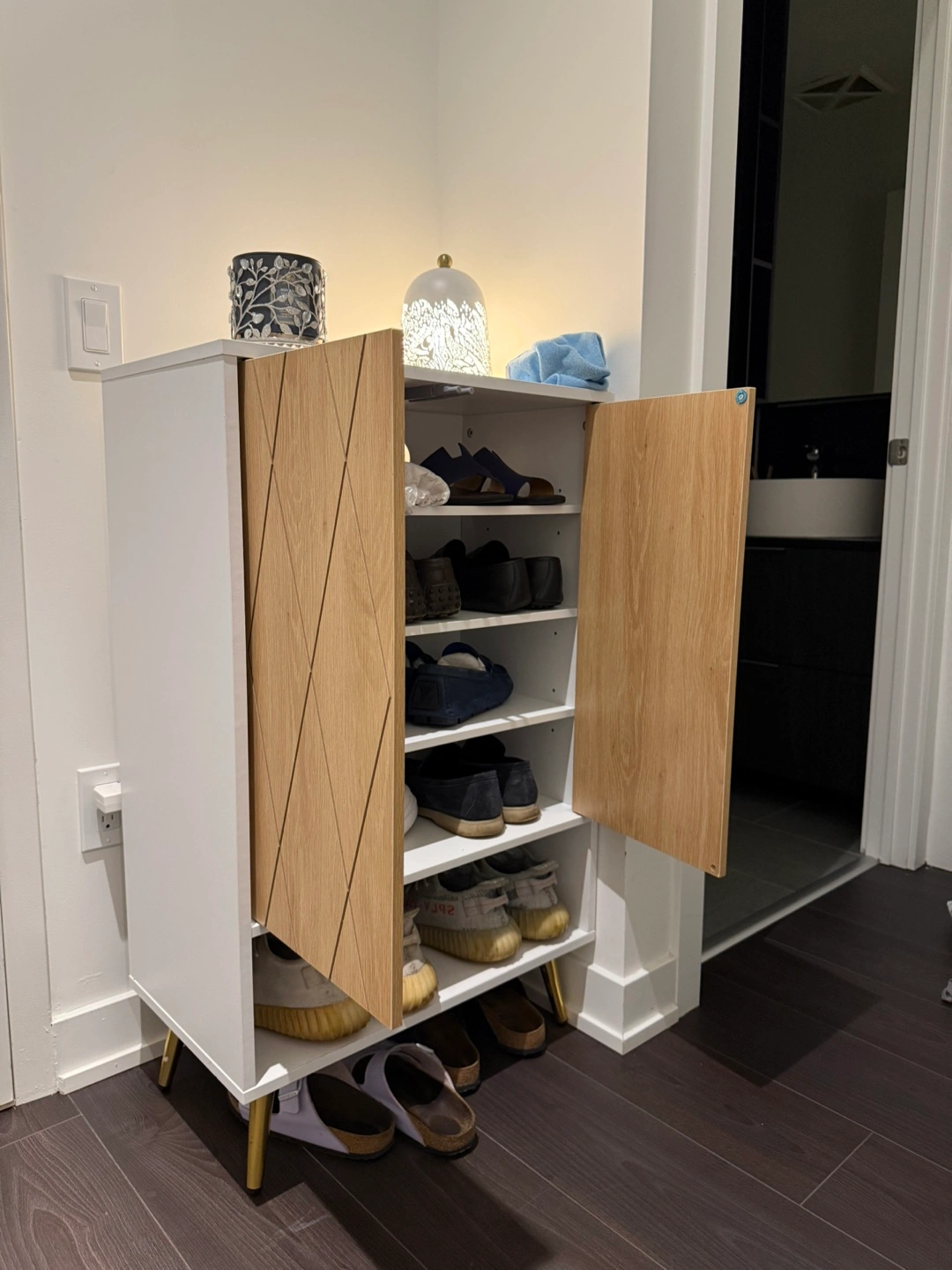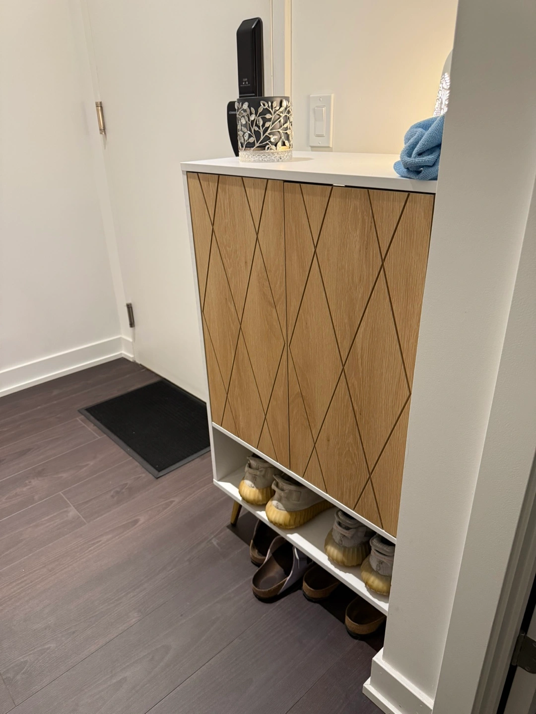 Selling a shoe cabinet in great condition! It features a white frame with oak-style doors. Plenty of space for shoes and looks great in any entryway or closet