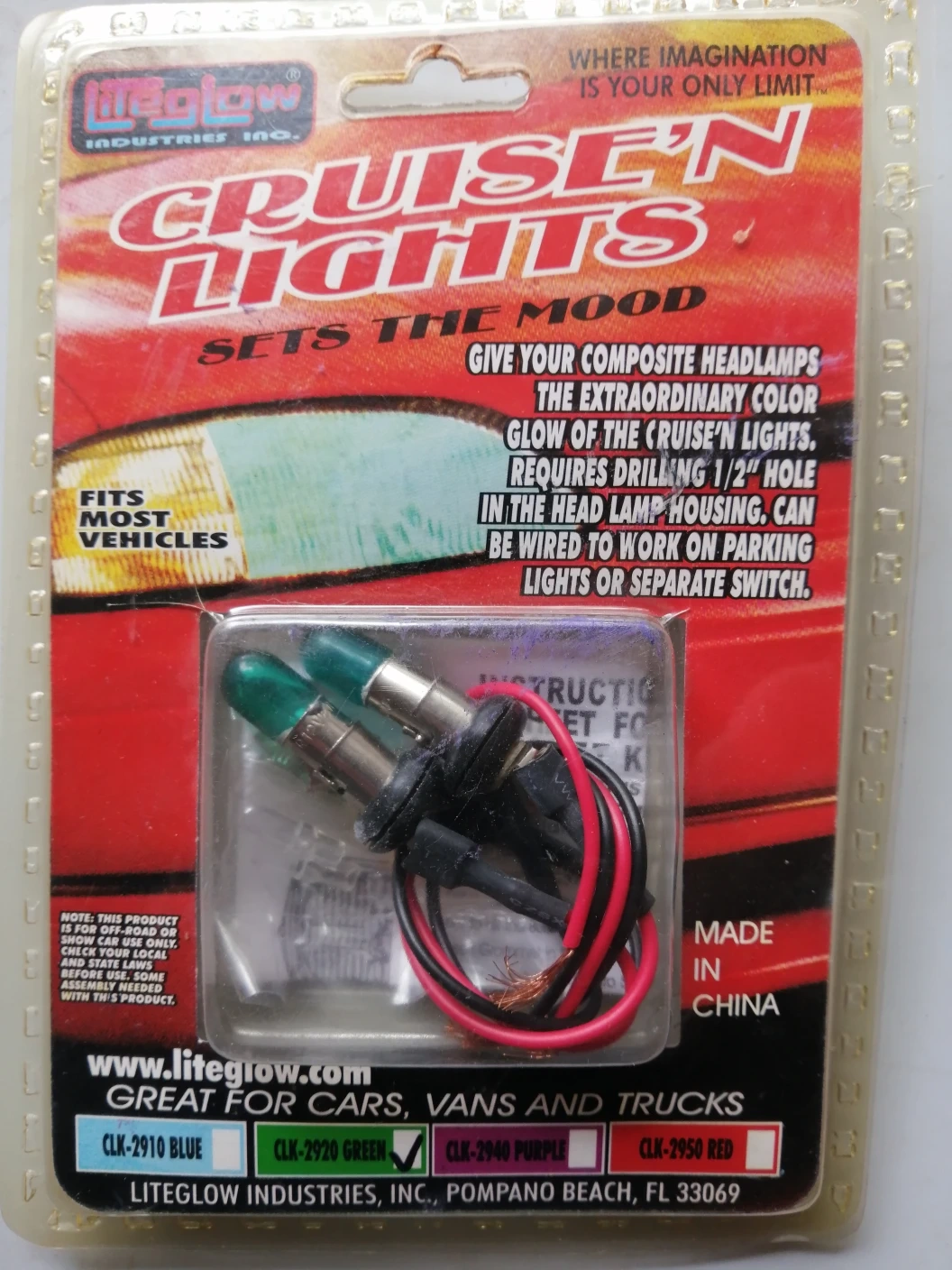 Green Cruise'n Lights. Fits most vehicles. Requires drilling 1/2" hole in headlamp housing. Wired to parking lights or separate switch. Made in China. Off-road or show car use only.
