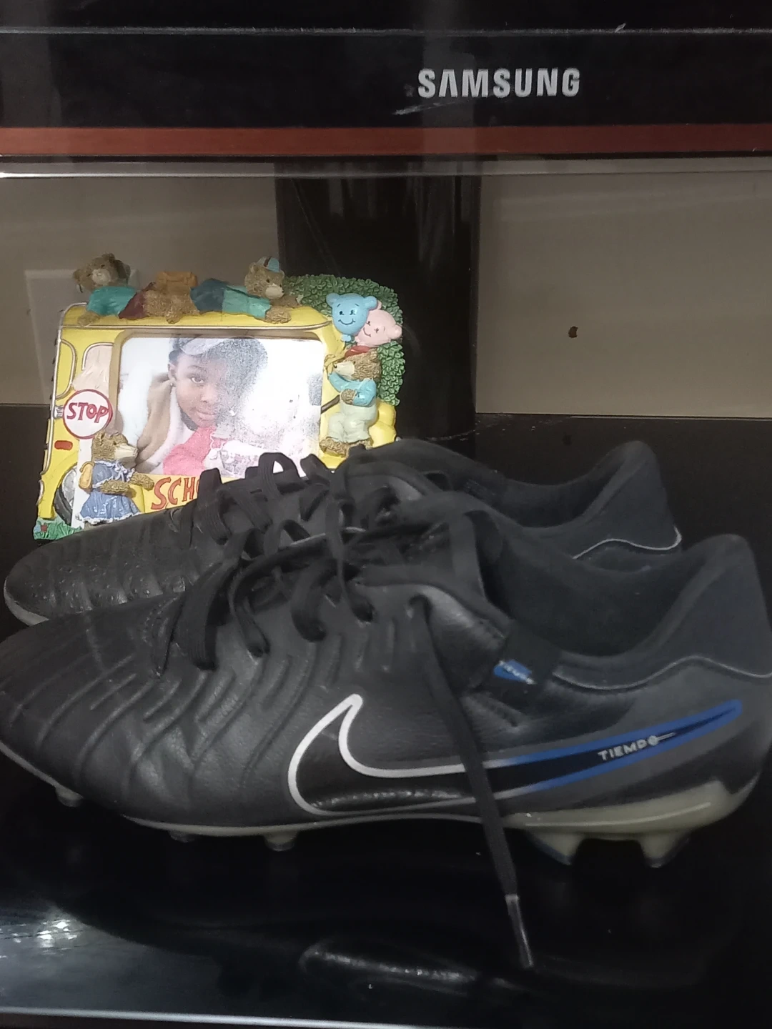Black Nike Tiempo soccer cleats with blue accents. Features a durable design for the field. Cleats are designed for soccer play.