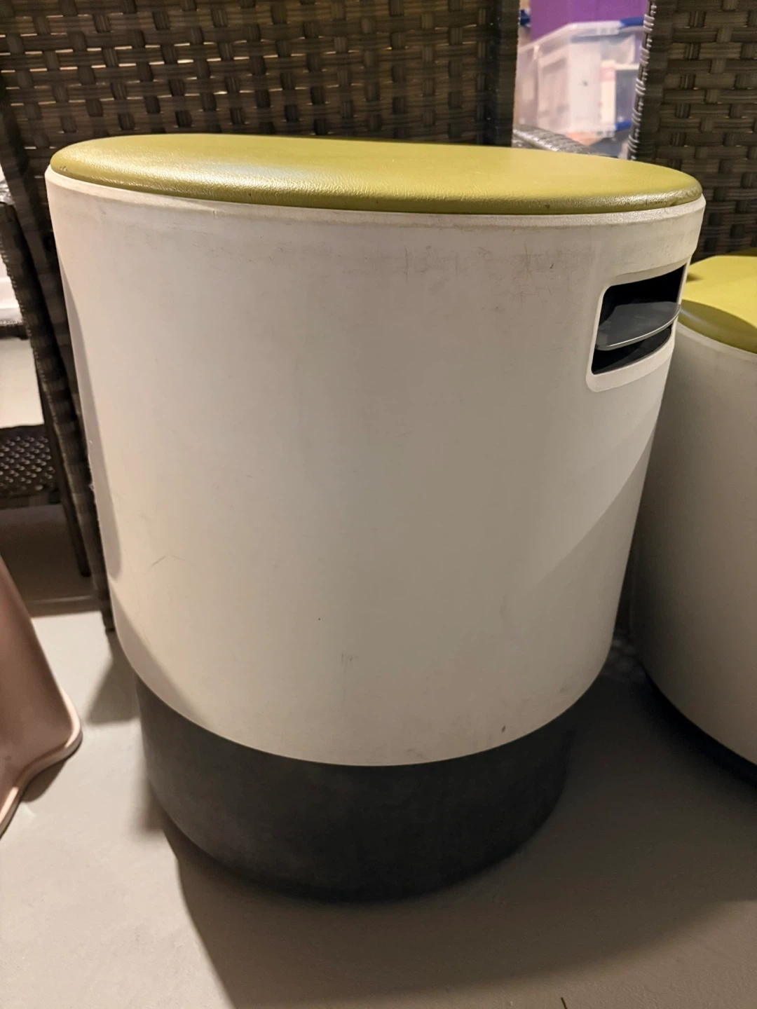 Two modern round ottomans or stools with a grey base and white cylindrical body. They feature a light green vinyl top and built-in handles for easy carrying. These versatile pieces can be used for seating or as footrests. Adjustable height.