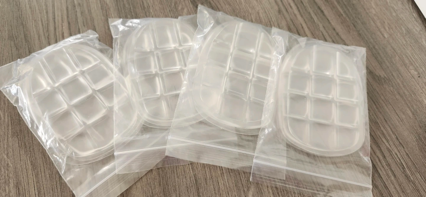 These clear silicone heel cups are designed for comfort and support. They're made from soft, flexible silicone with a grid pattern for cushioning. Each pack includes four individual heel cups.
