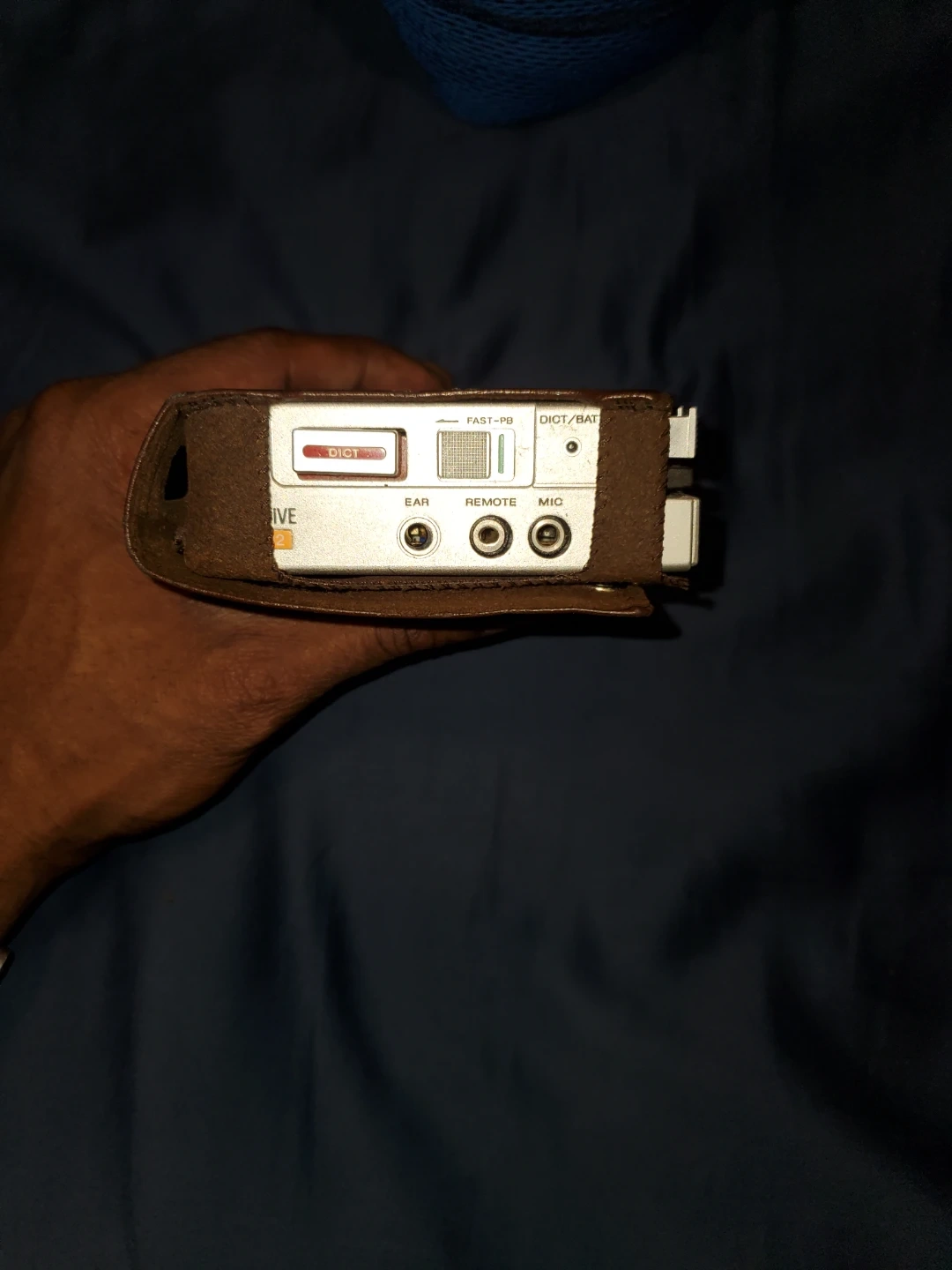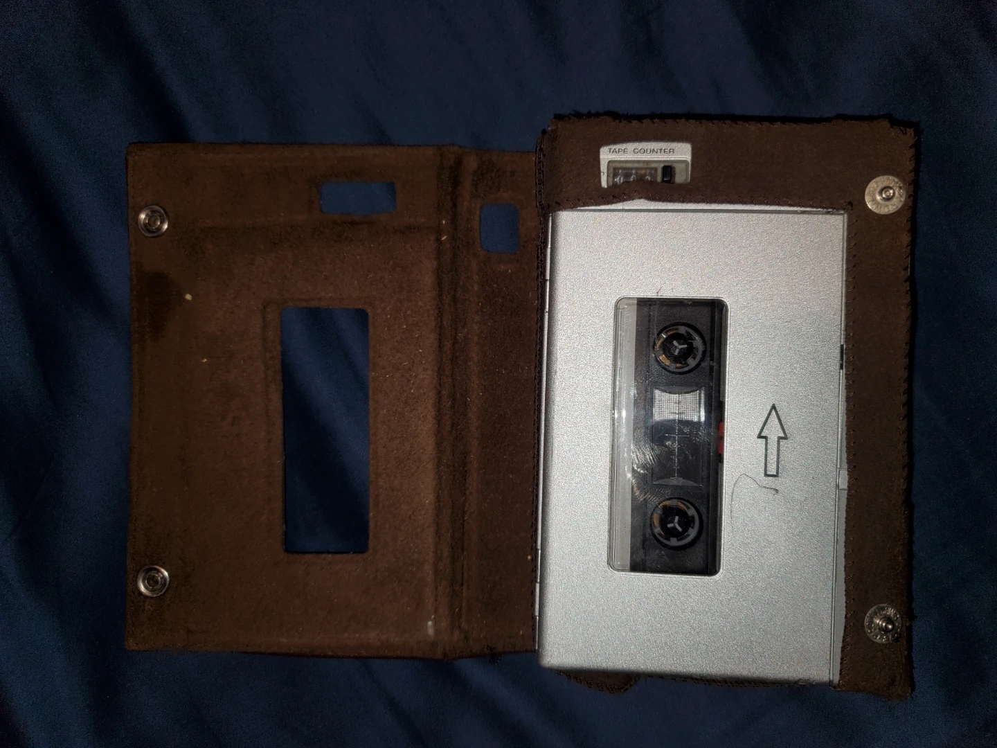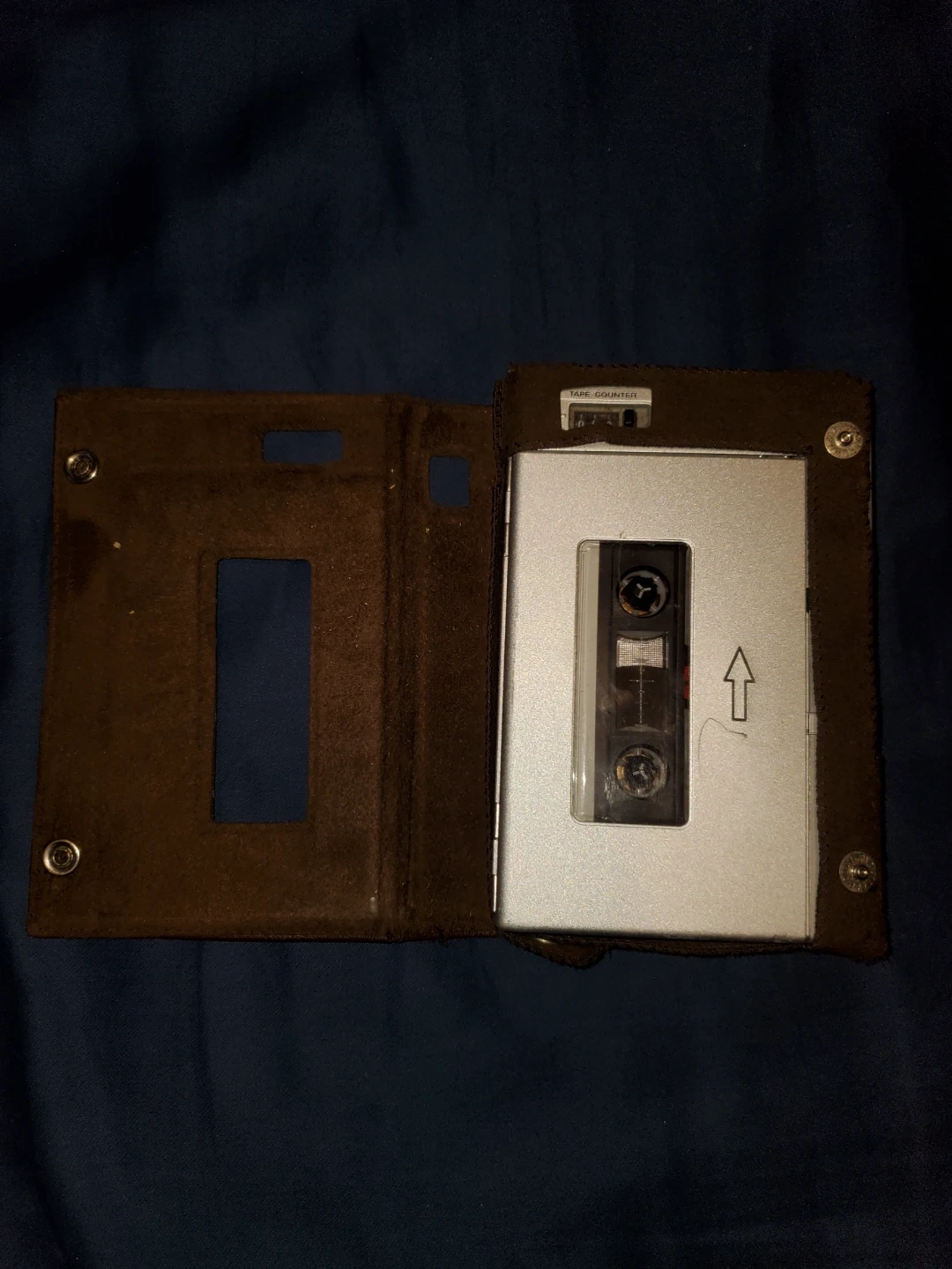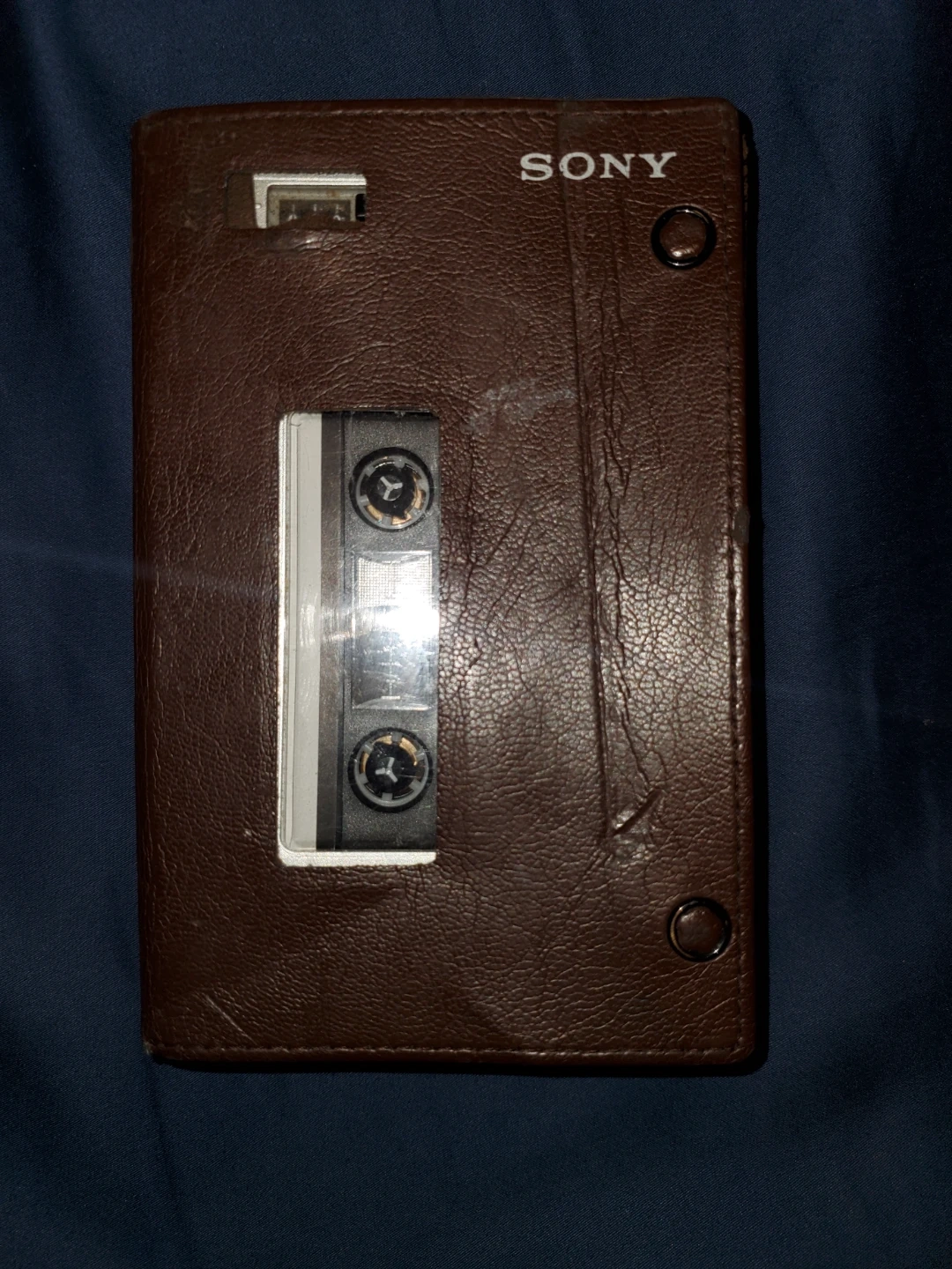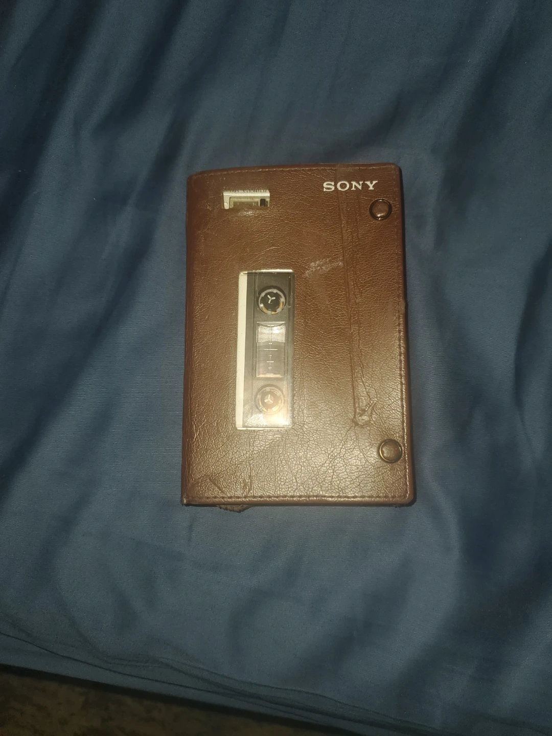This is a Sony Walkman portable cassette player. It comes with its original brown protective case. Features include earphone, remote, and mic jacks. Also has a tape counter and fast-forward/rewind controls.