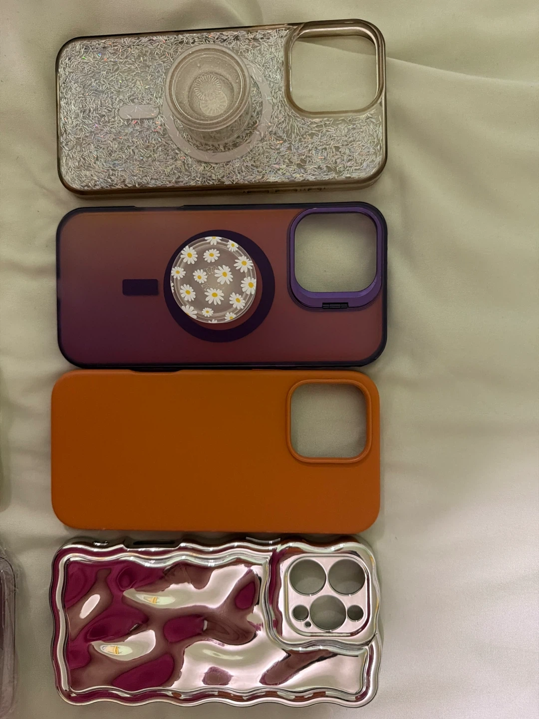 Selling a variety of iPhone cases! There's a silver glitter case with a pop socket, a purple ombre case with a daisy pop socket, a solid orange case, and a wavy silver and purple case. All in great condition!