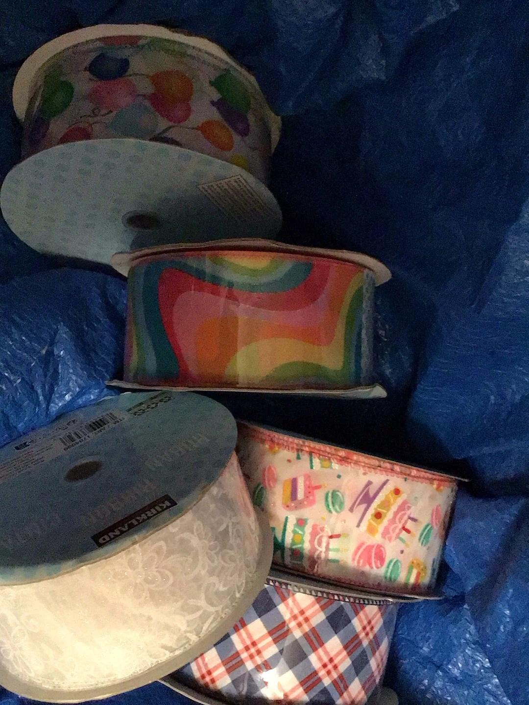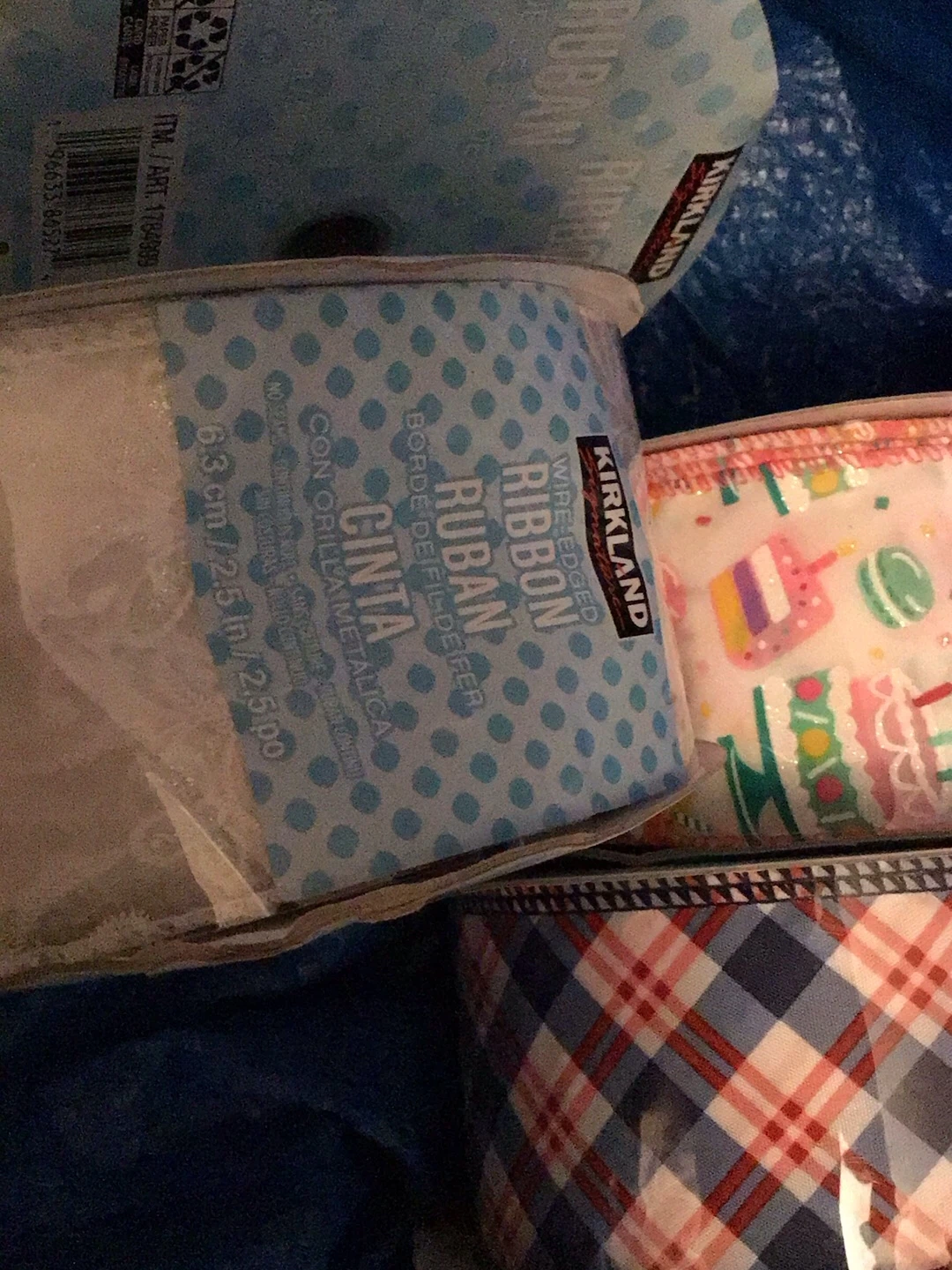 This is a collection of wired ribbons for crafting and decorating. One roll is white with a lace pattern, another is blue with polka dots, and there's also a roll with a birthday cake design and a festive plaid pattern. These ribbons are 6.3 cm or 2.5 inches wide. Perfect for gift wrapping and seasonal decor!