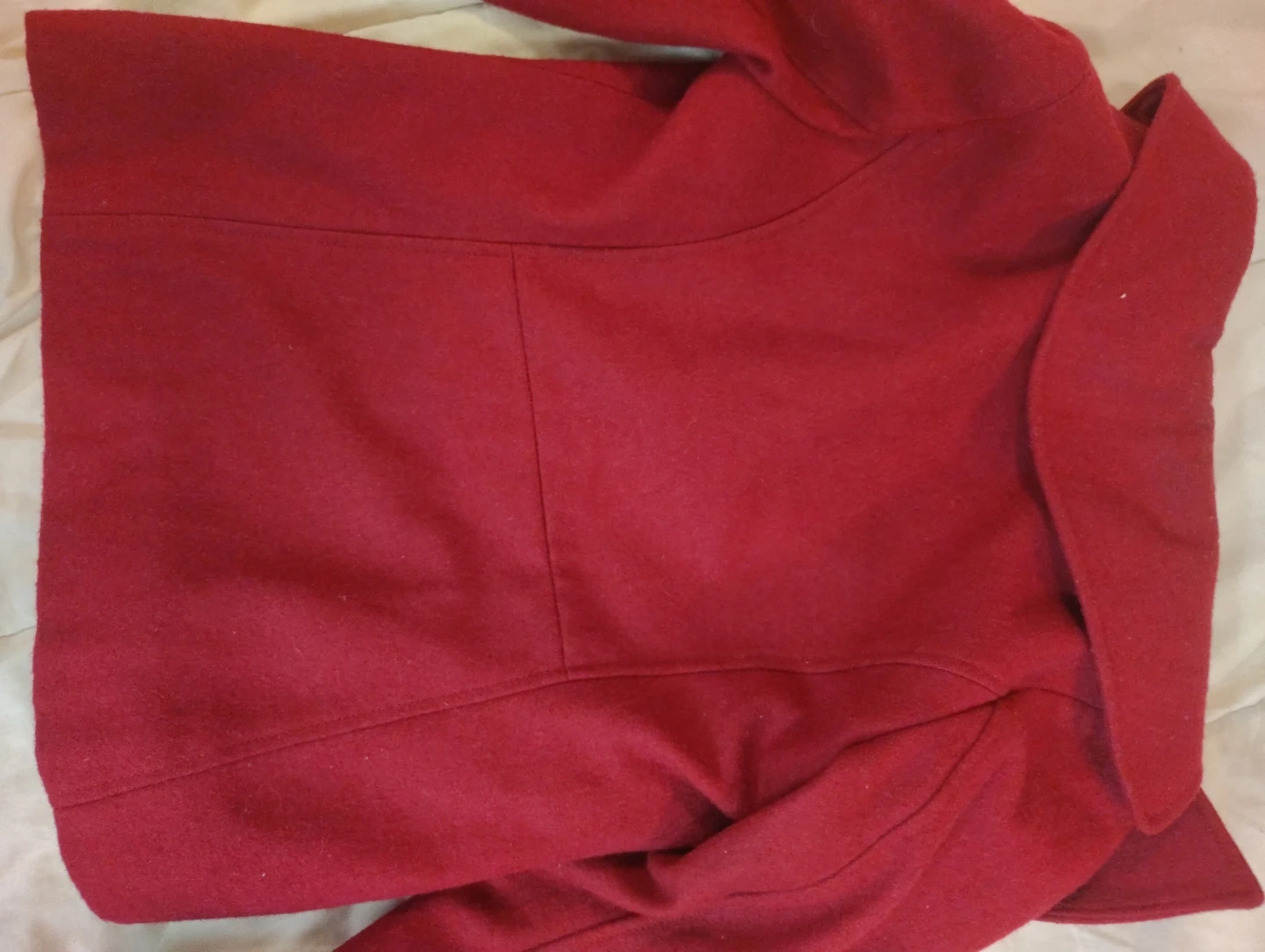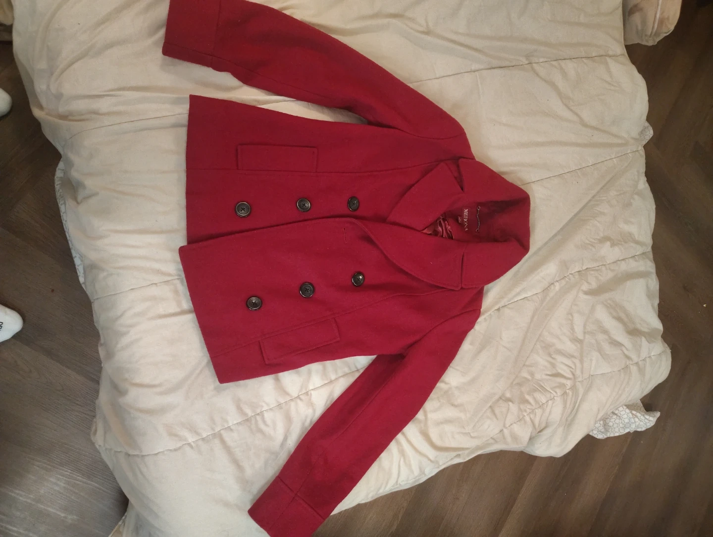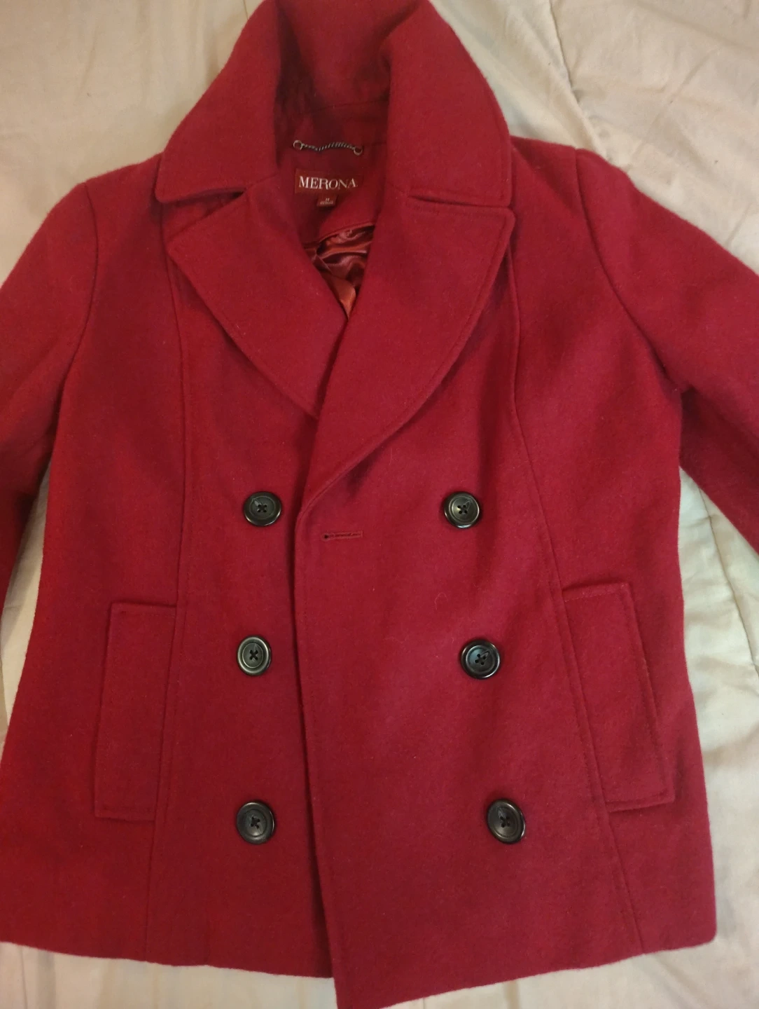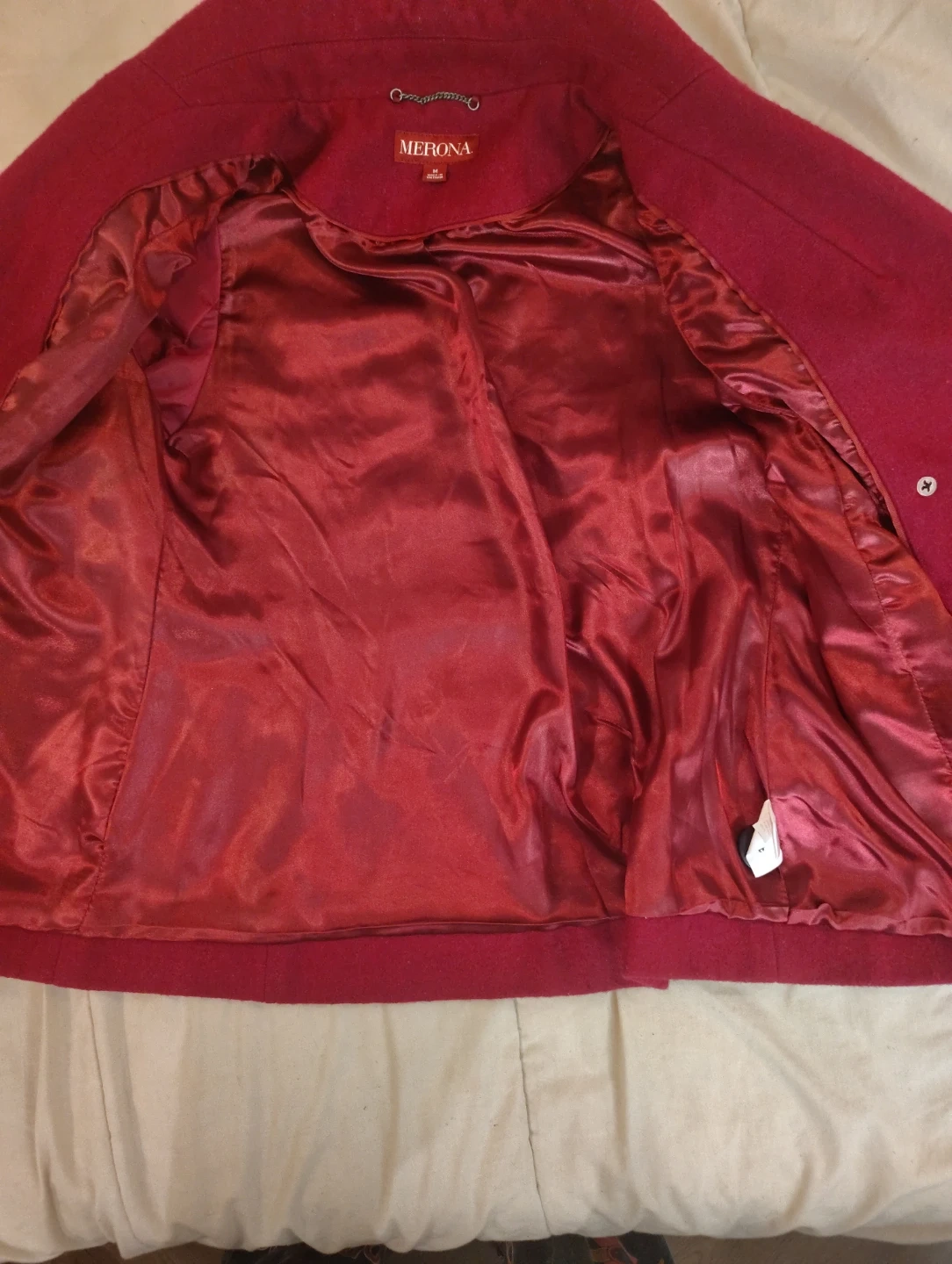 This Like New Size Medium Merona pea coat is red and features a double-breasted closure with buttons. It has a satin lining inside. The outer material appears to be a wool blend. It's a stylish option for cooler weather!