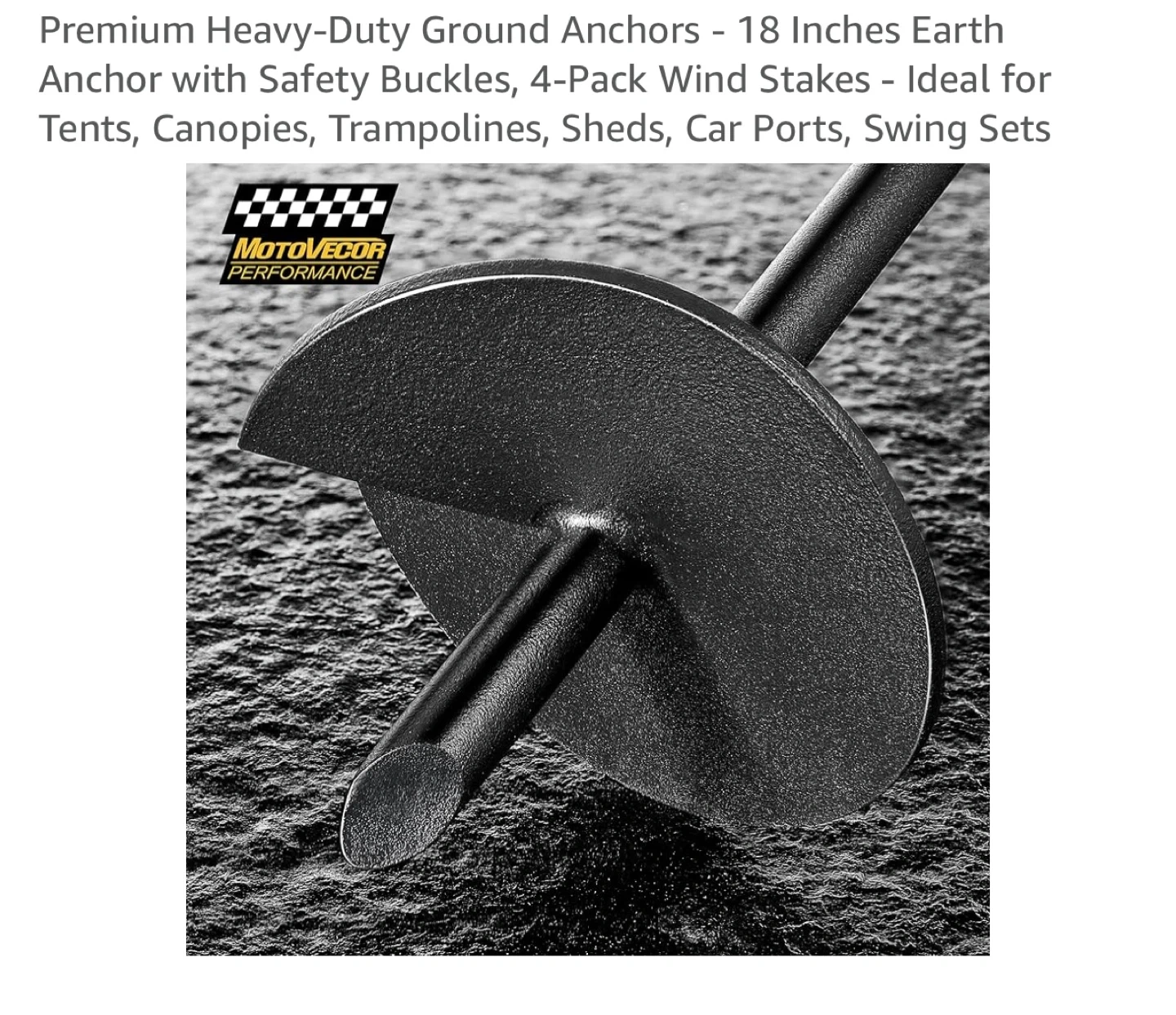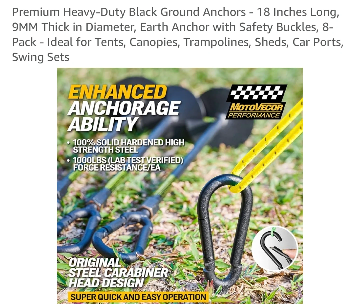 This is an 8-pack of Motovecor heavy-duty black ground anchors, each measuring 18 inches long. They're constructed from 100% solid hardened high-strength steel and are powder-coated for anti-rust protection. These anchors provide 1000lbs of force resistance each. They're useful for securing tents, canopies, trampolines, sheds, car ports, and swing sets.
