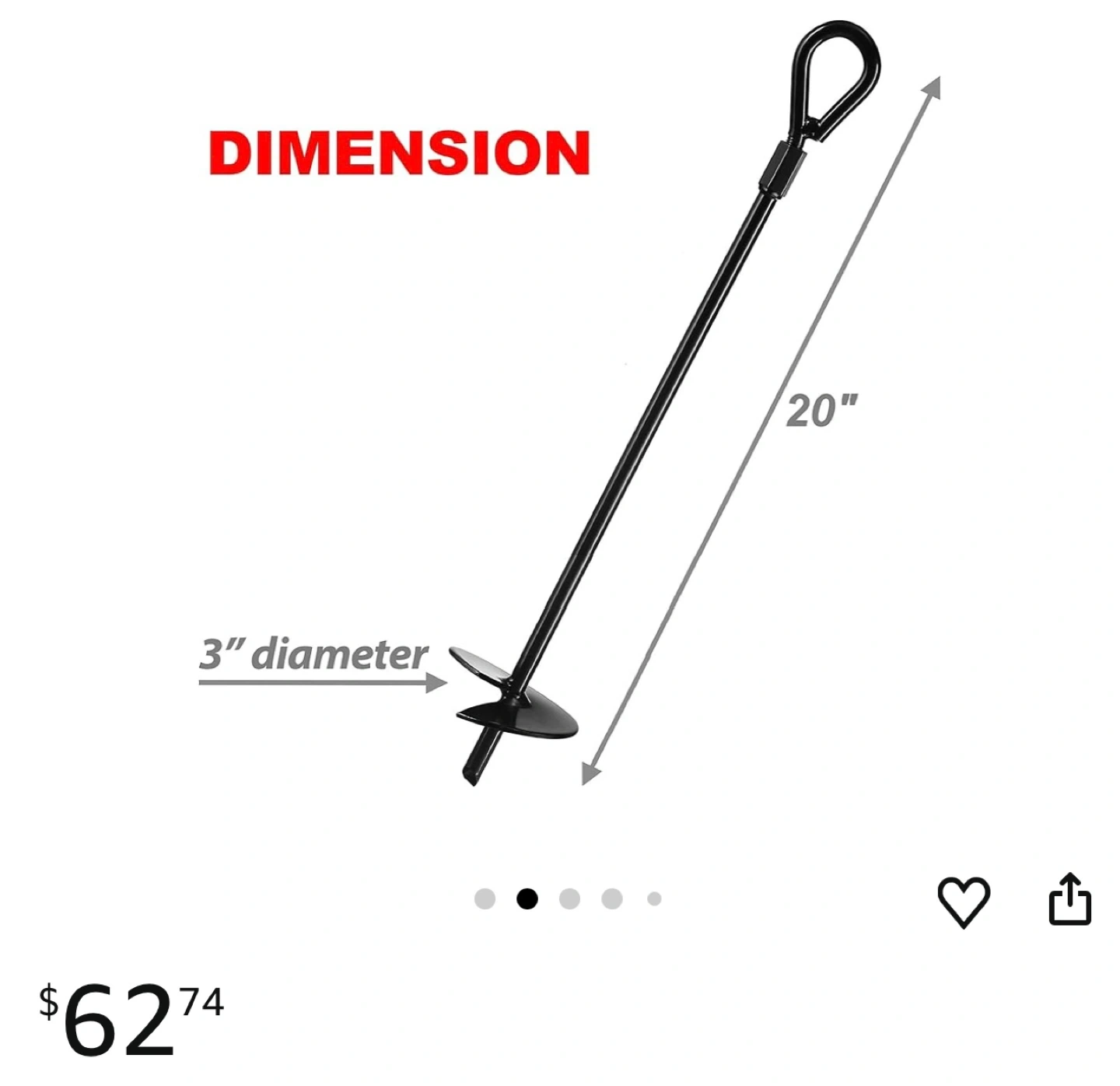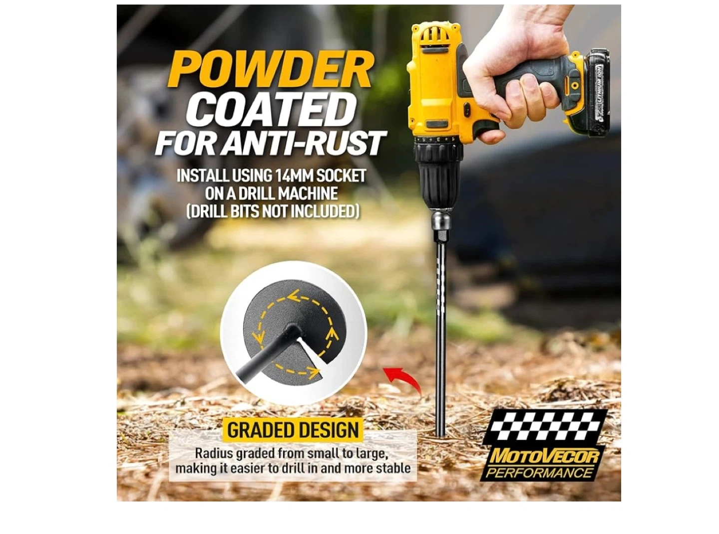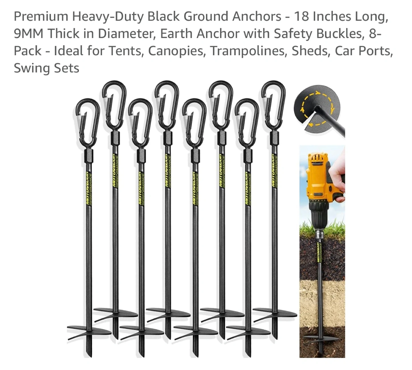 This is an 8-pack of Motovecor heavy-duty black ground anchors, each measuring 18 inches long. They're constructed from 100% solid hardened high-strength steel and are powder-coated for anti-rust protection. These anchors provide 1000lbs of force resistance each. They're useful for securing tents, canopies, trampolines, sheds, car ports, and swing sets.