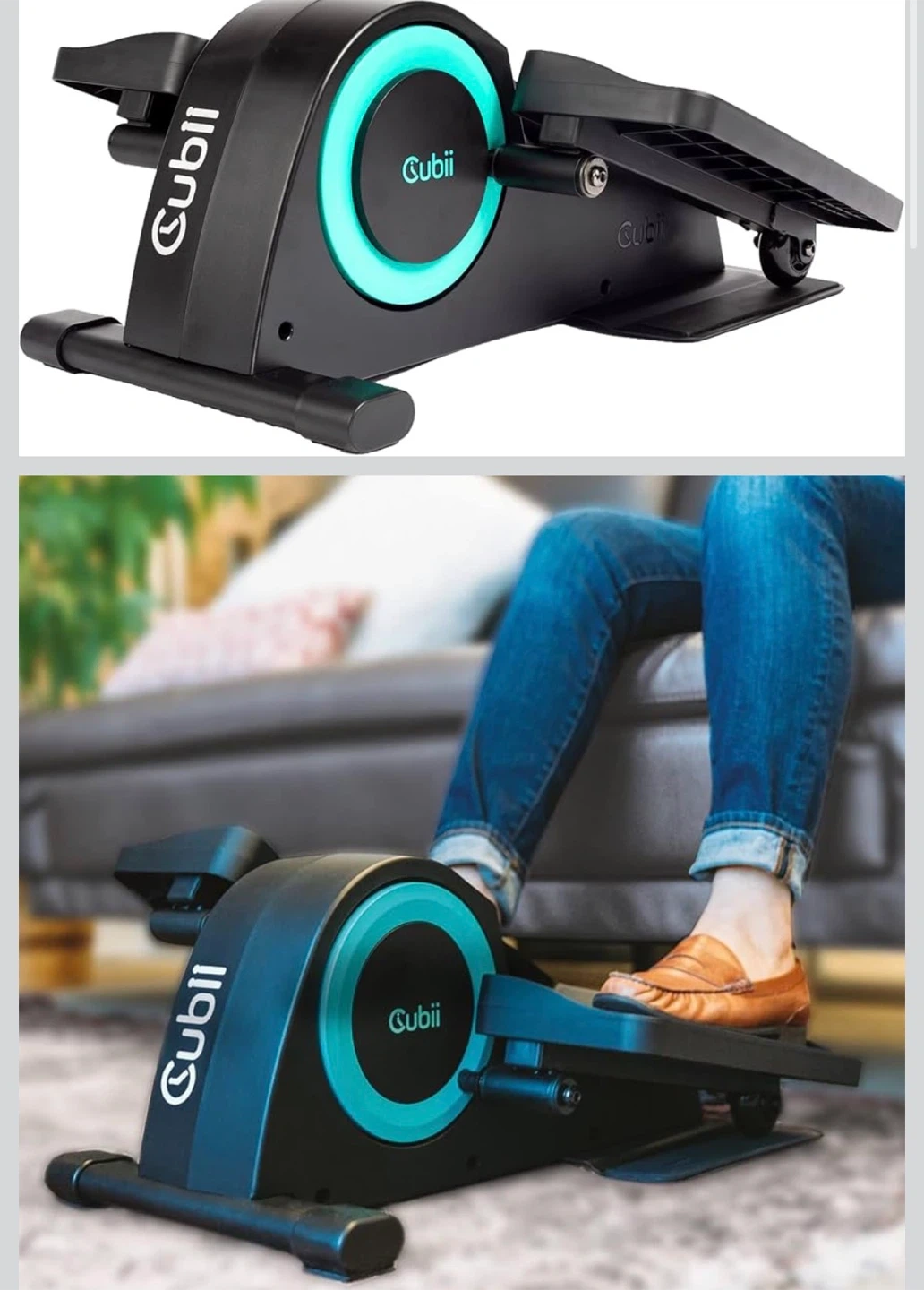This is a Cubii under-desk elliptical in black with teal accents. It's designed for low-impact exercise while seated. Great for small spaces and offices!