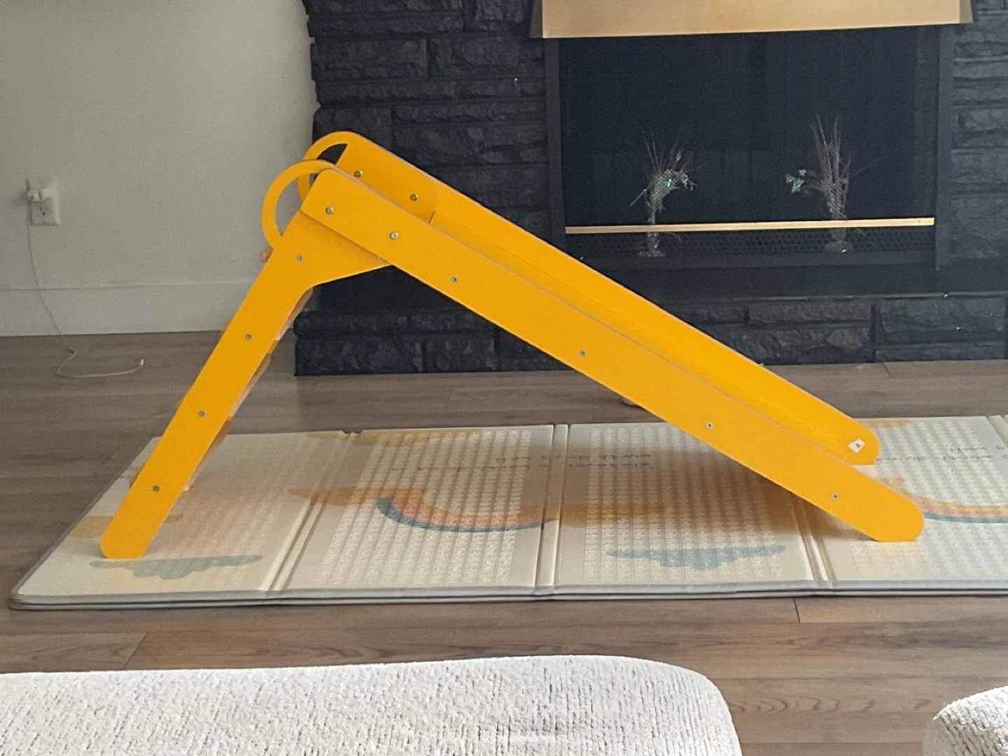 This yellow wooden climber slide is perfect for little ones. It's designed for indoor play and made from durable wood. It offers a safe way for toddlers to develop gross motor skills. A fun addition to any playroom! Pick up from delta Surrey or Langley