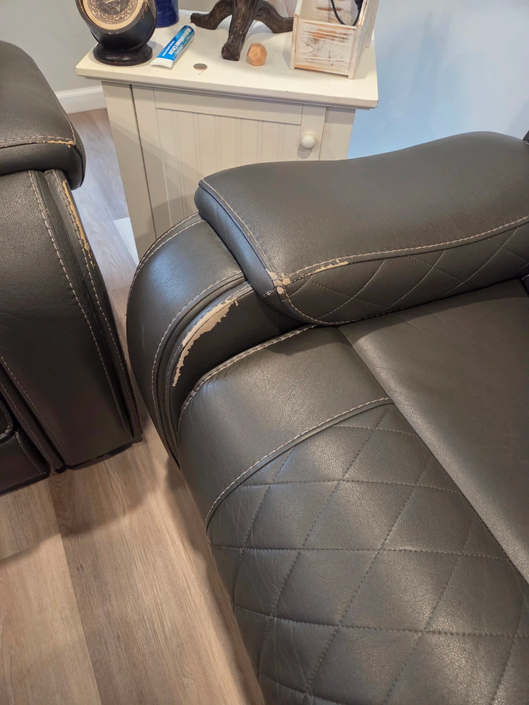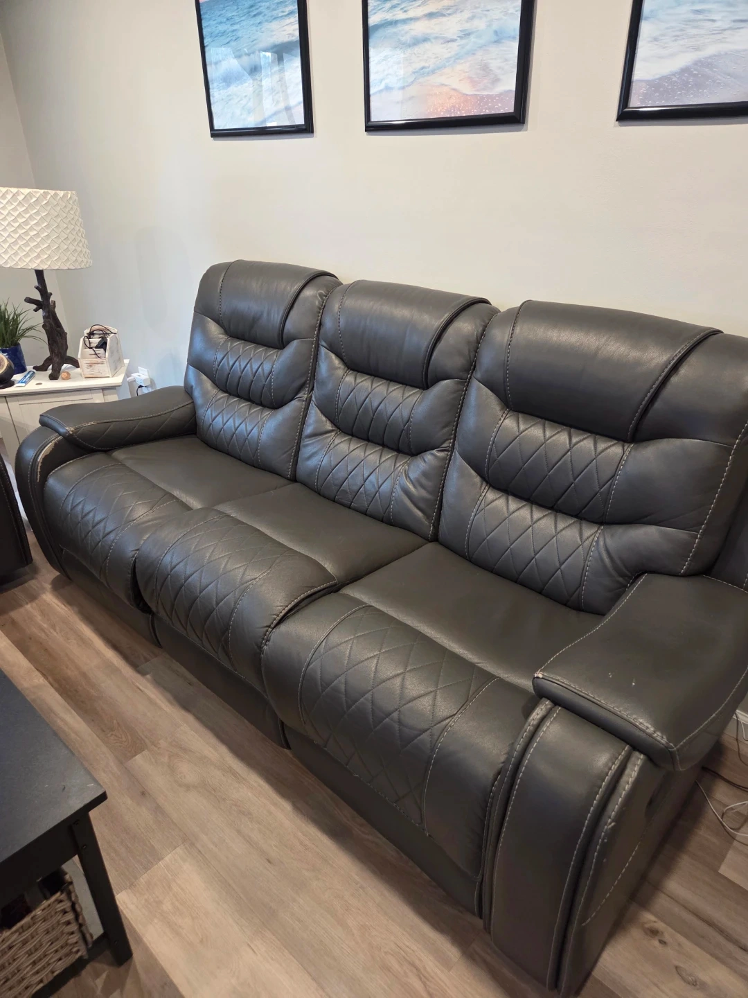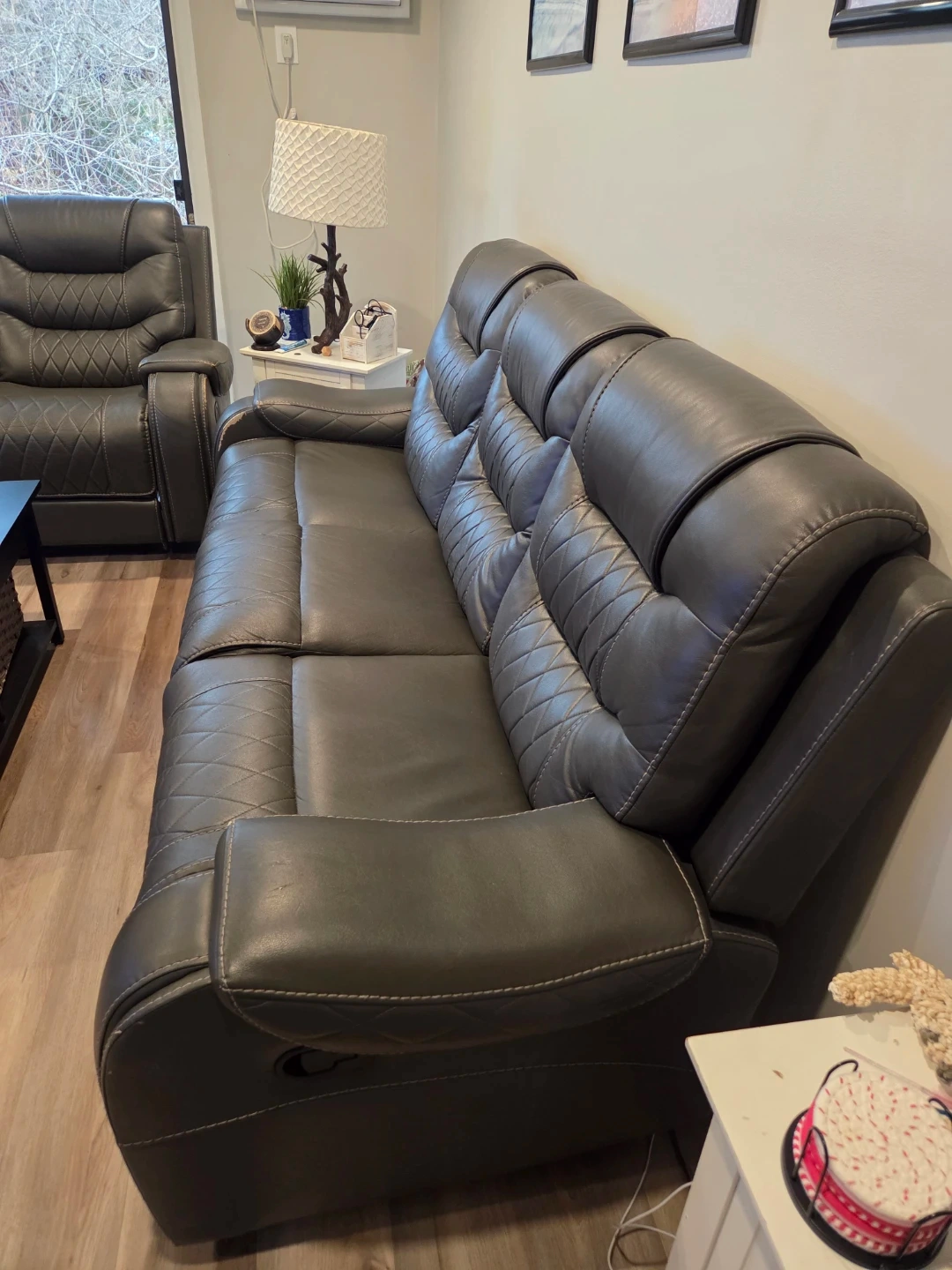 2 Gray faux leather reclining loveseat. Features diamond stitching detail and two cup holders in the center console. Some wear and tear visible on the armrests, as shown in photos. Perfect for a living room or home theater.