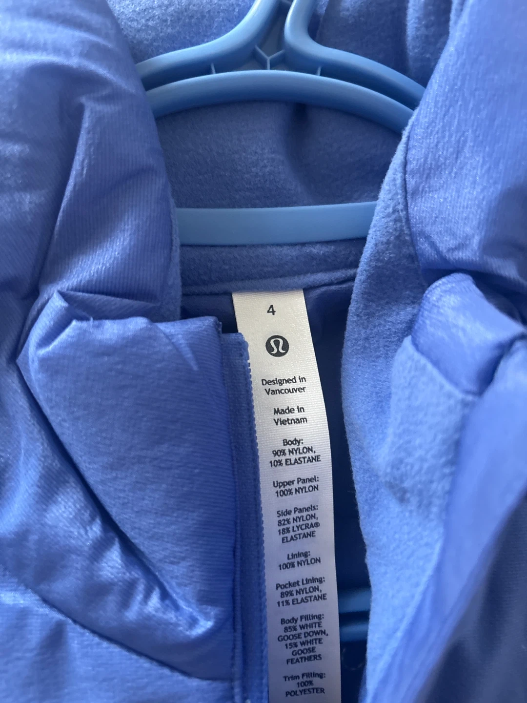 Selling a Lululemon Down for It All Vest in size 4. It's a beautiful blue colour and in great condition! The body is made of 90% nylon and 10% elastane, with a body filling of 85% white goose down and 15% white goose feathers. Designed in Vancouver and made in Vietnam. PRICE IS FIRM!!!