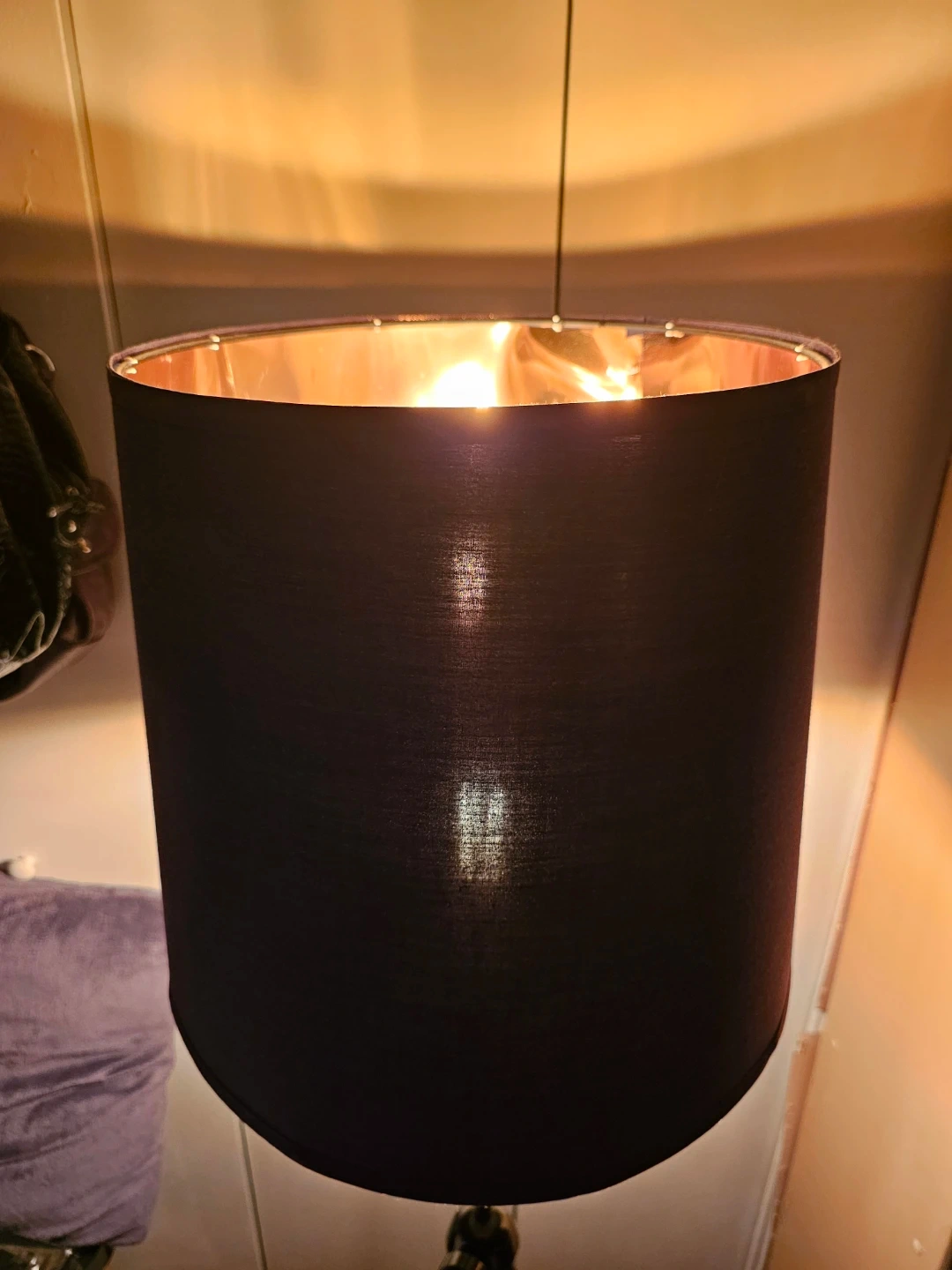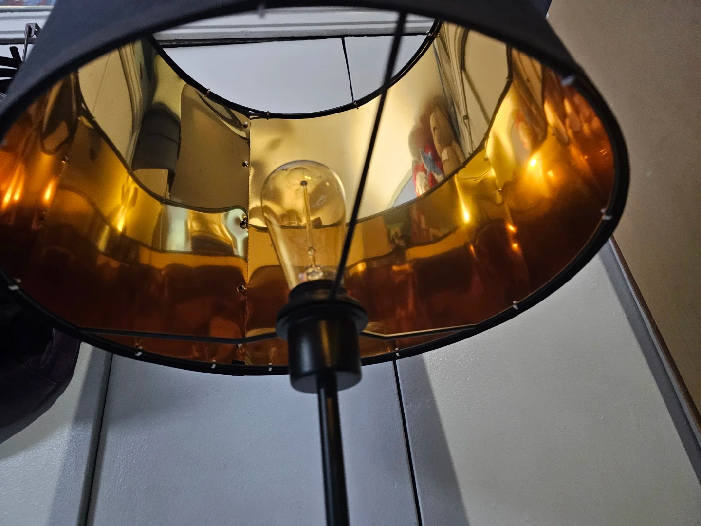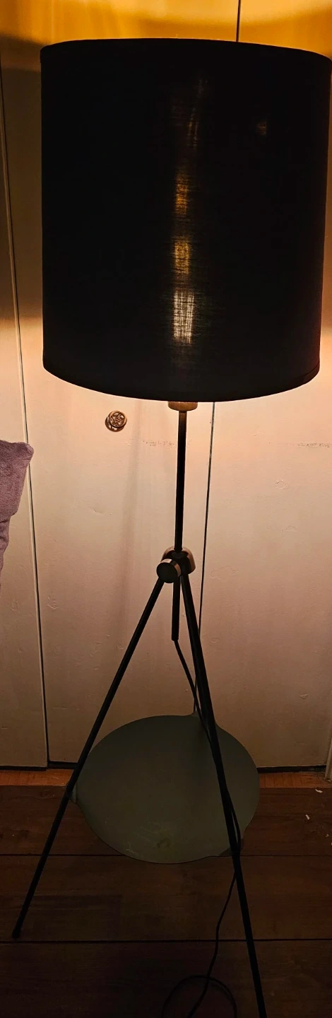 This stylish floor lamp features a black fabric drum shade with a reflective gold interior. Its sturdy black tripod base includes a small circular shelf for convenience. It's a great addition to any living space!