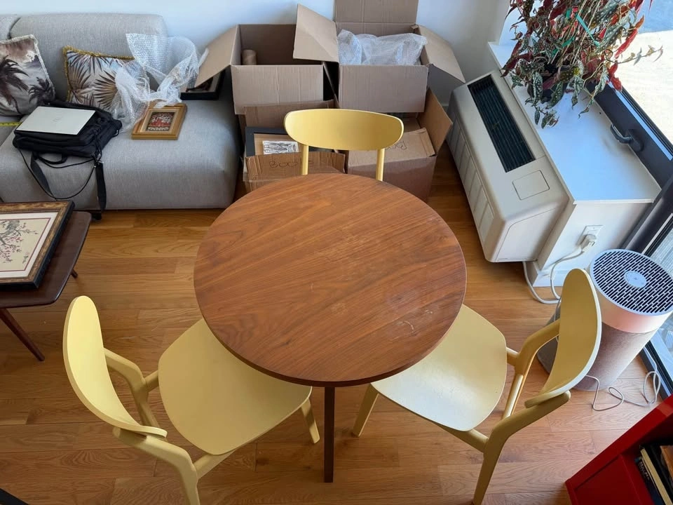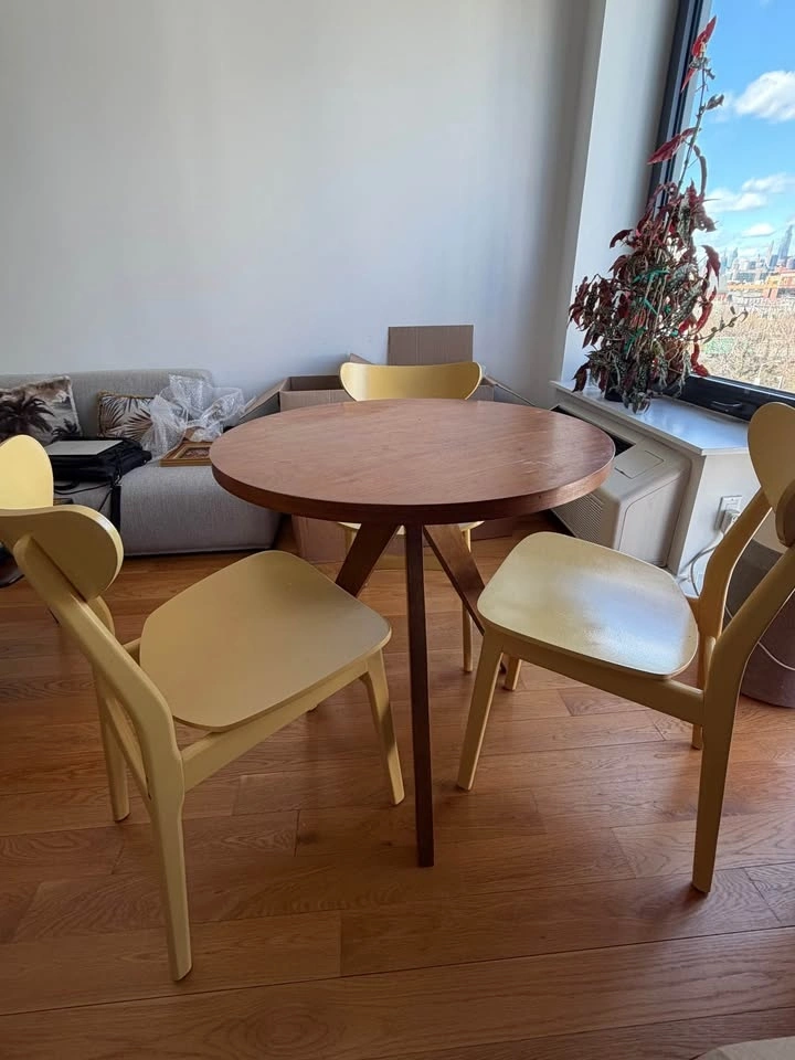 Beautiful round dining table from West Elm with a warm walnut finish and mid-century modern design. Perfect size for apartments or small dining areas while still comfortably seating 4. Chairs are also for sale. The table has a solid, sturdy base and a timeless look that works with many styles. Condition: Good overall with some light surface marks from normal use (shown in photos), but still looks great and functions perfectly. Great for a breakfast nook, kitchen, or small dining space.