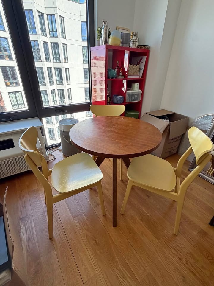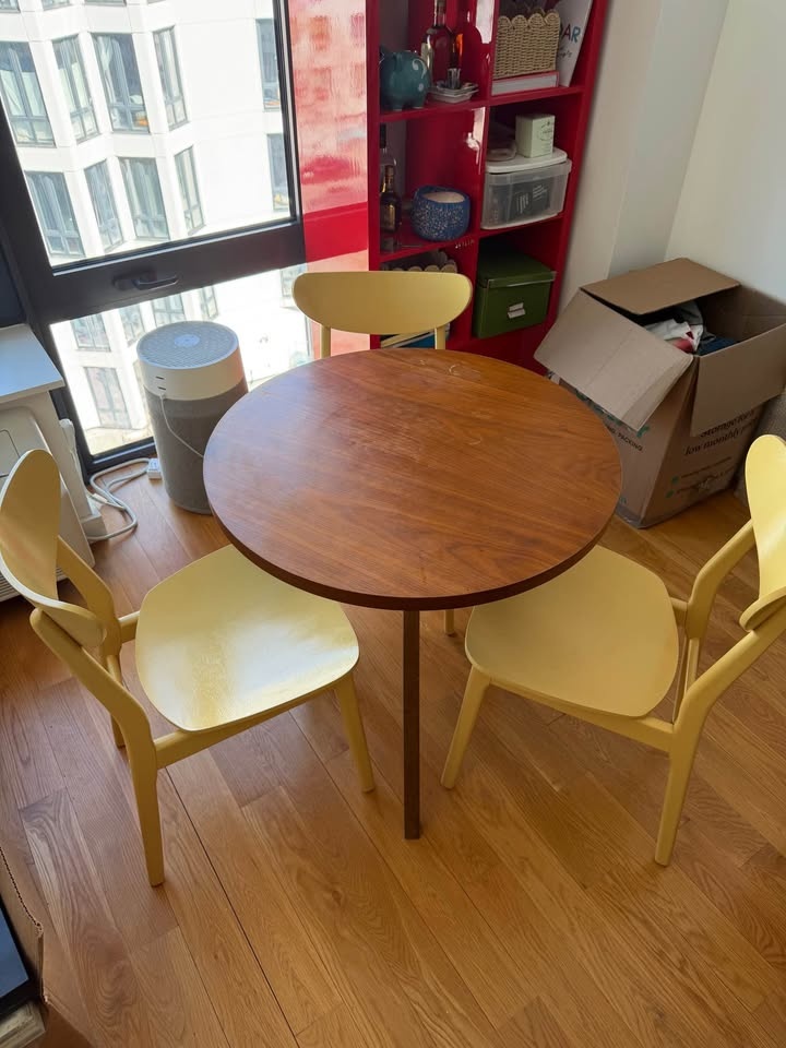 Beautiful round dining table from West Elm with a warm walnut finish and mid-century modern design. Perfect size for apartments or small dining areas while still comfortably seating 4. Chairs are also for sale. The table has a solid, sturdy base and a timeless look that works with many styles. Condition: Good overall with some light surface marks from normal use (shown in photos), but still looks great and functions perfectly. Great for a breakfast nook, kitchen, or small dining space.