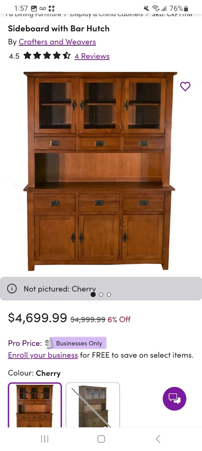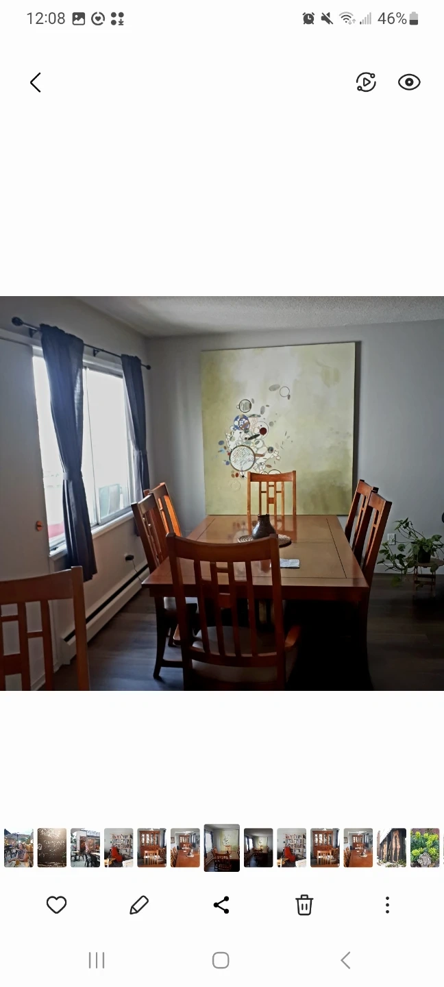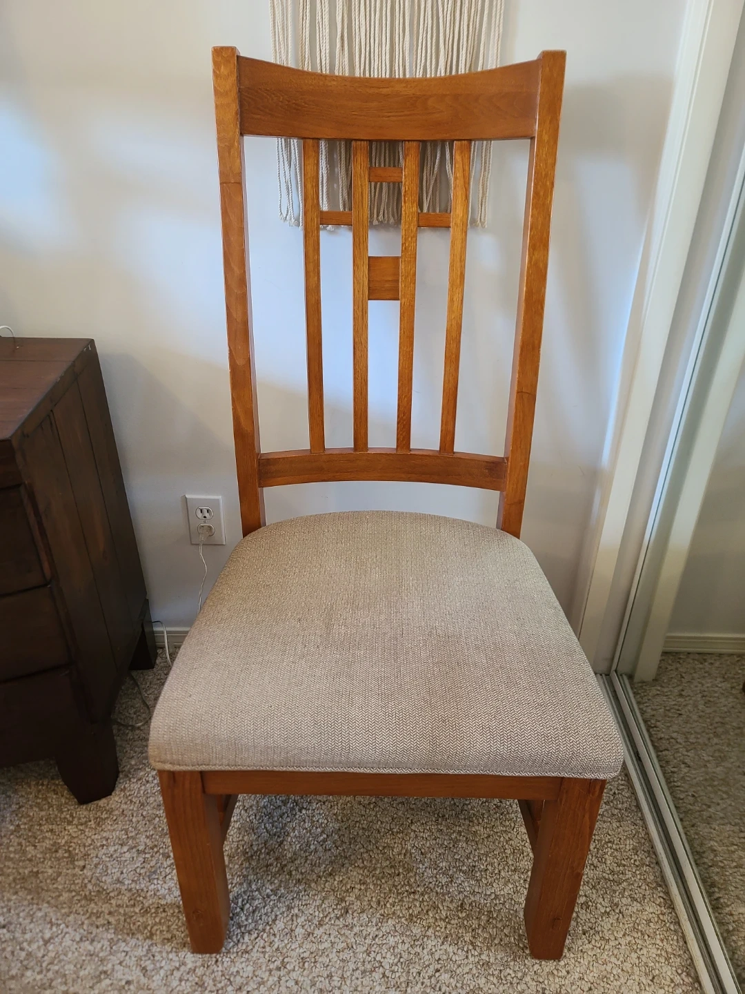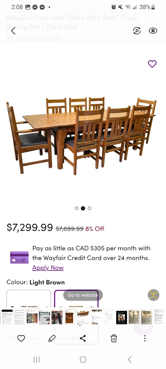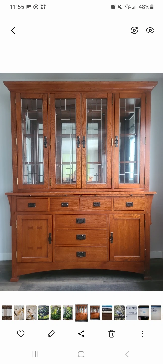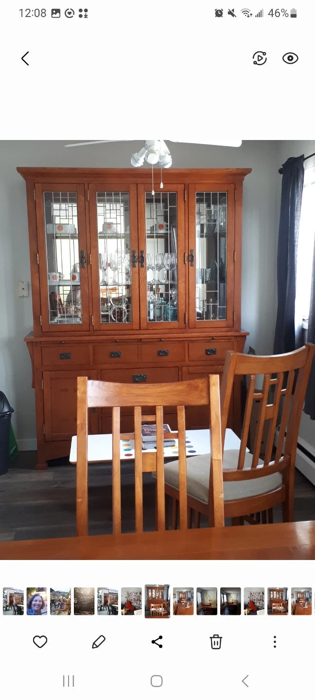 Includes one large wooden dining table and eight matching wooden chairs and Hutch.