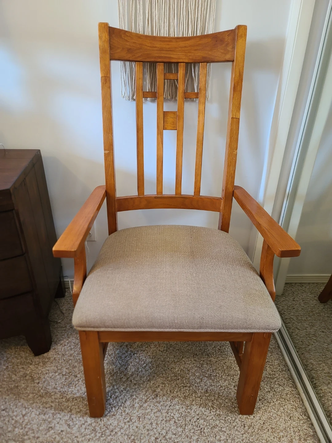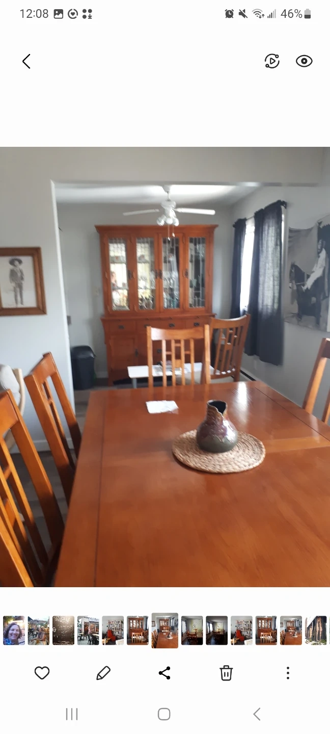 Includes one large wooden dining table and eight matching wooden chairs and Hutch.