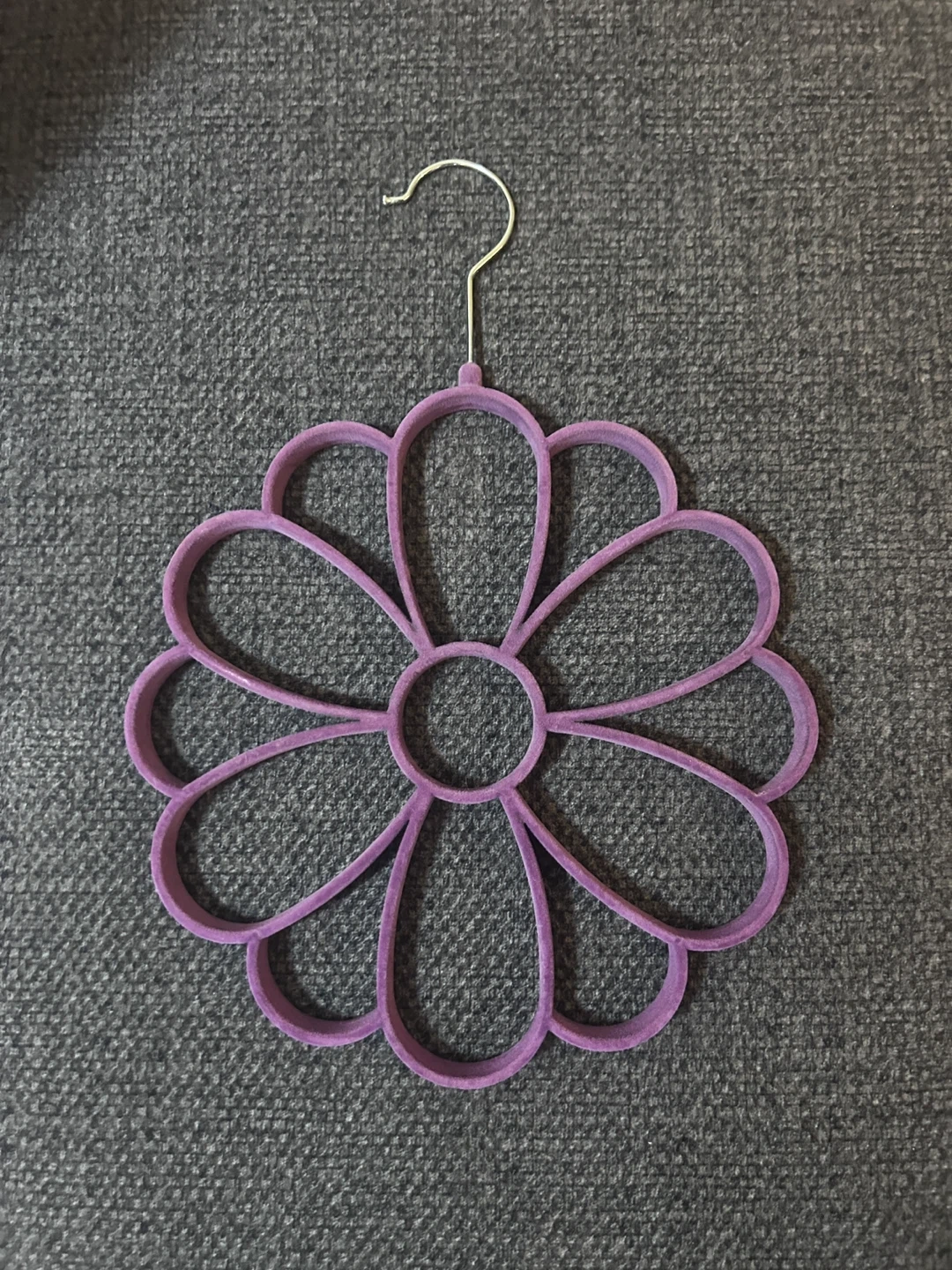 This purple hanger is shaped like a flower and is perfect for organizing scarves. It's made of a soft, felt-like material and features a metal hook for hanging. Great for keeping closets tidy!