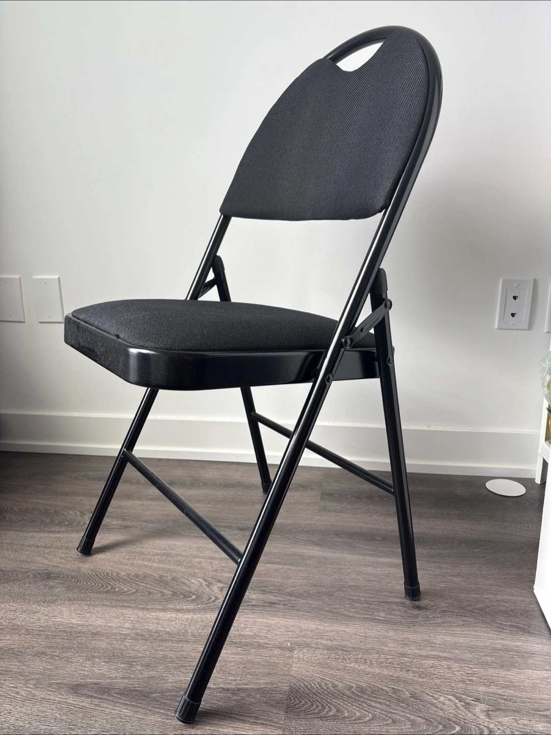 Selling a new unused black folding chair in great condition! It's perfect for extra seating when you have guests over, or for any situation where you need a portable and space-saving chair