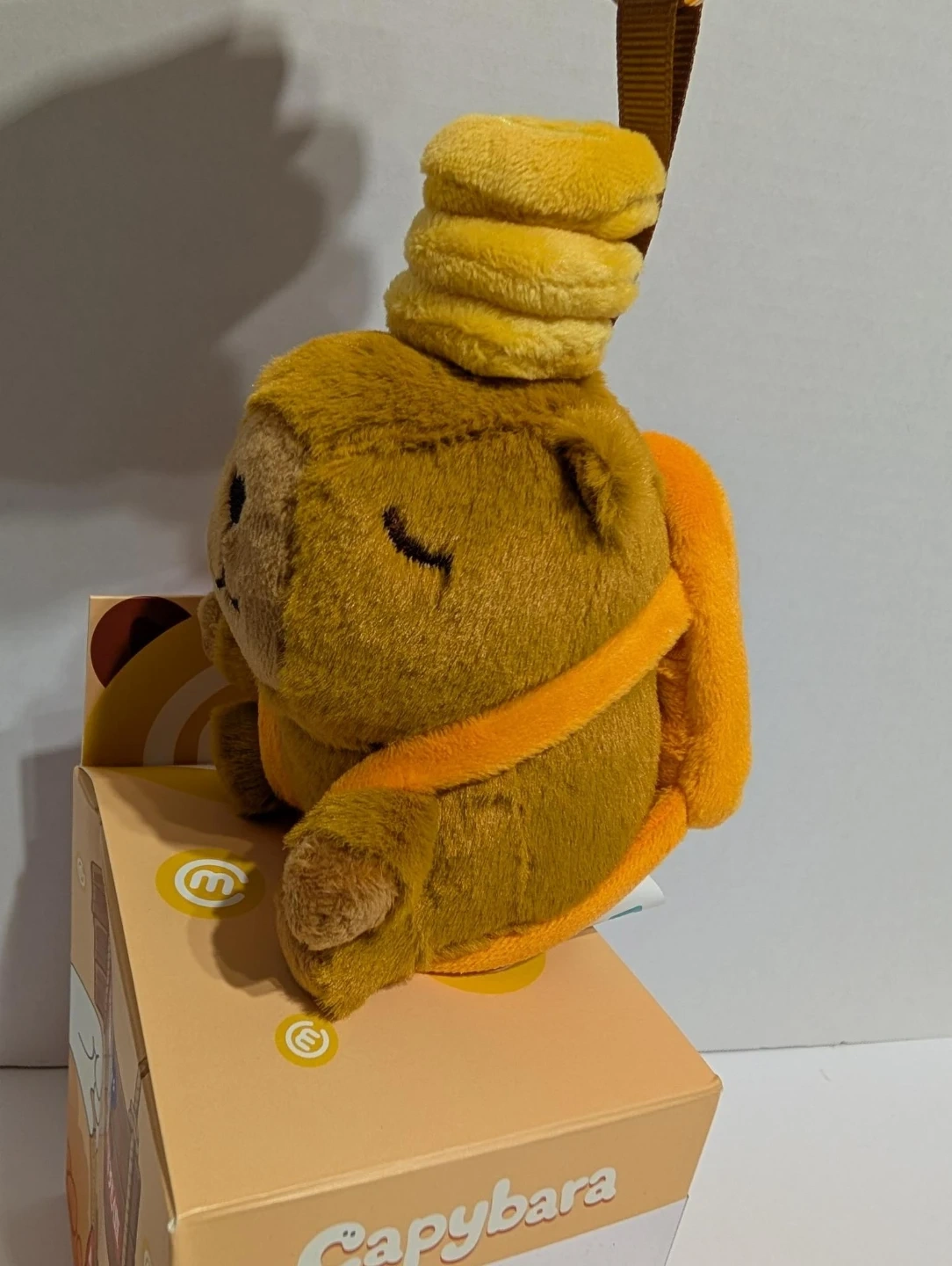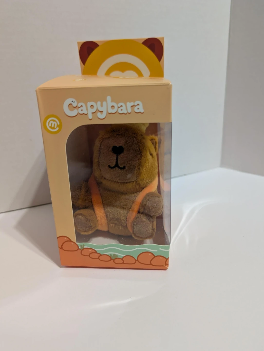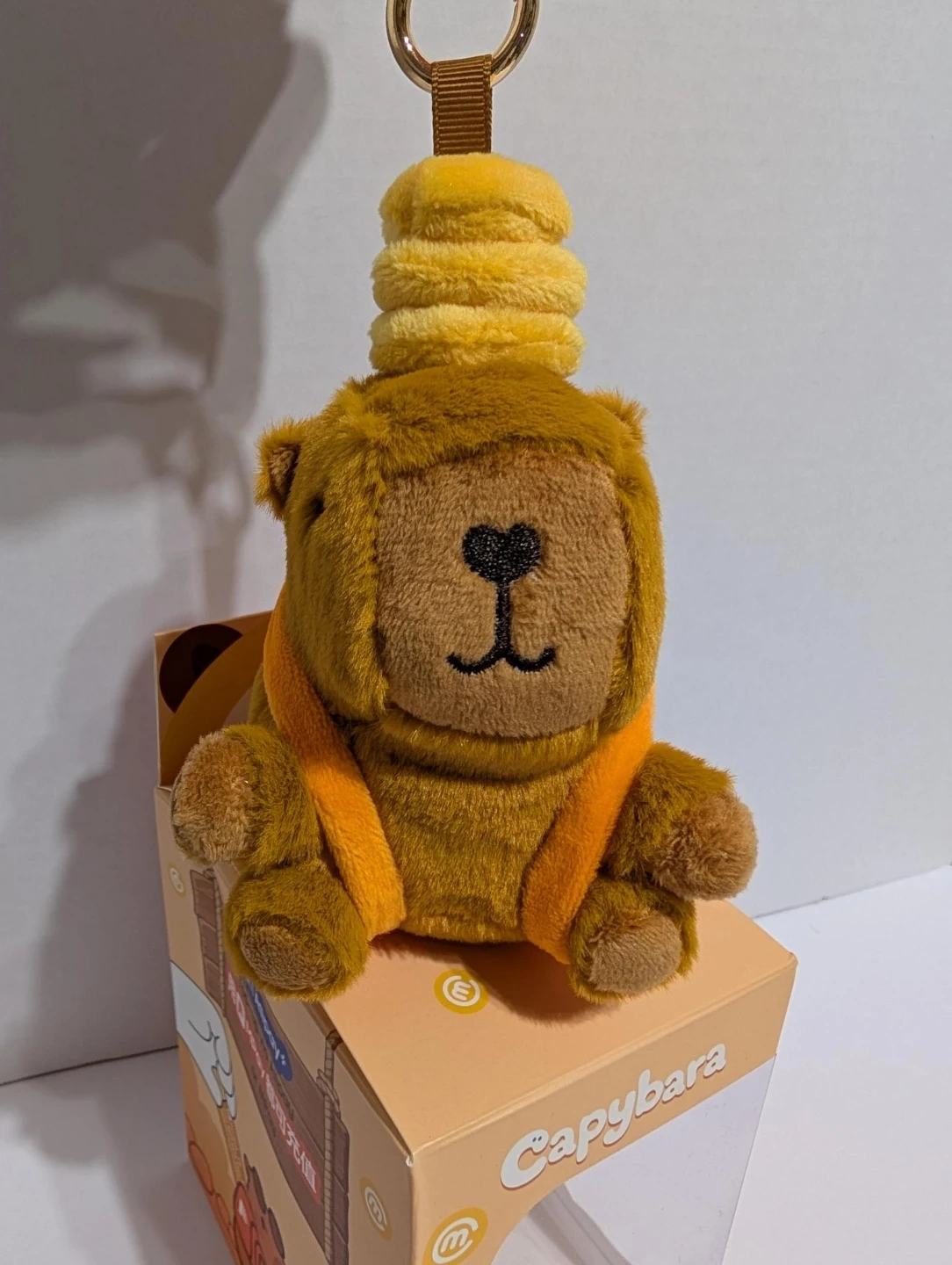This is a cute capybara plush toy with a keychain attachment. It's soft and comes in its original packaging. The plush is brown with orange accents and a yellow hat-like accessory.