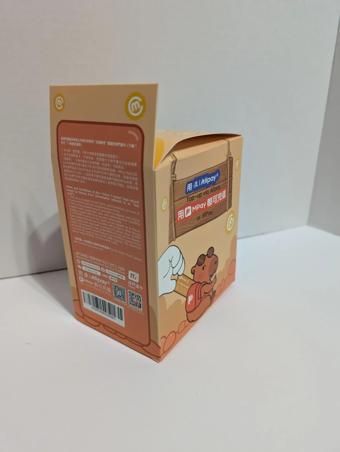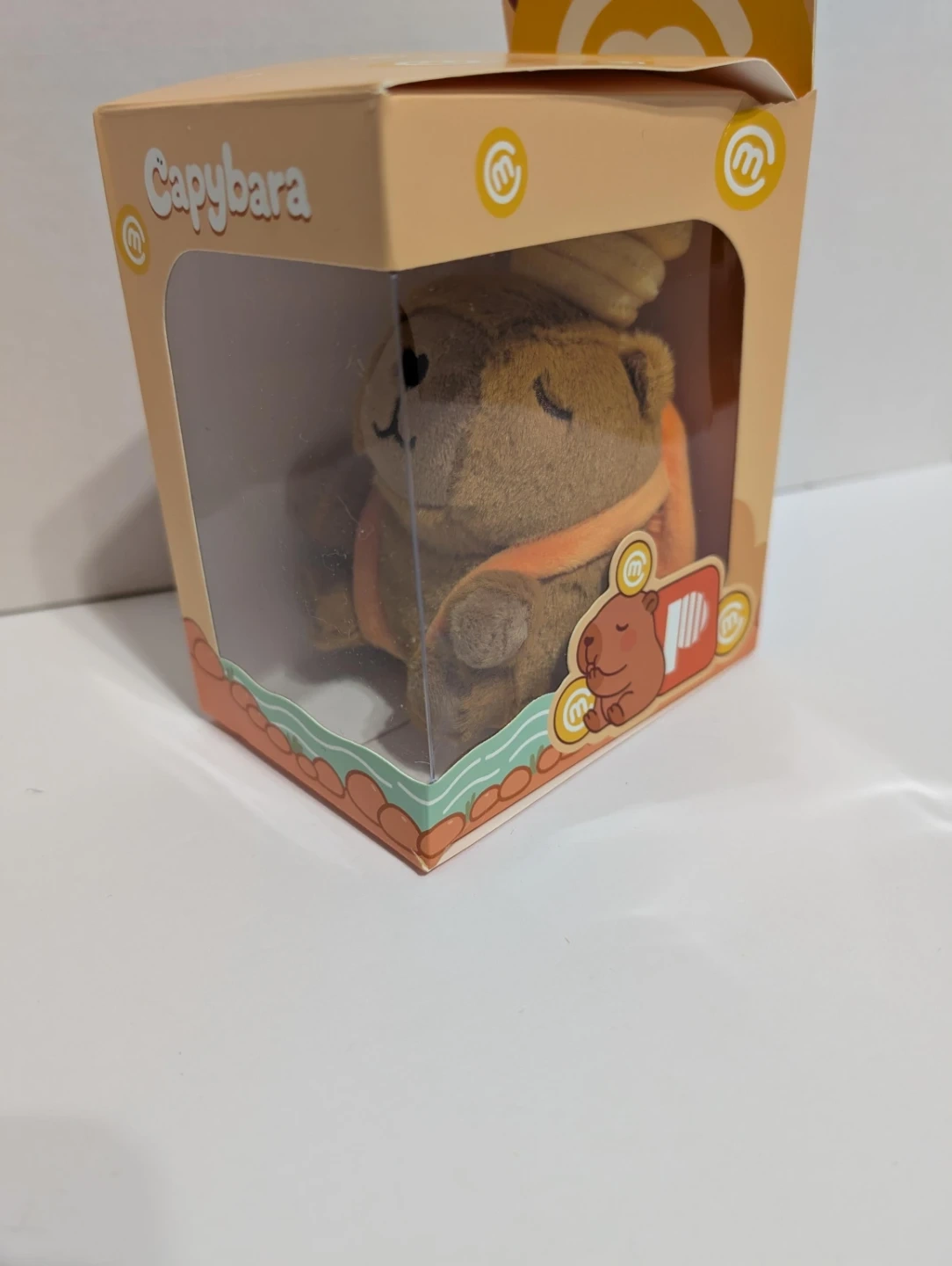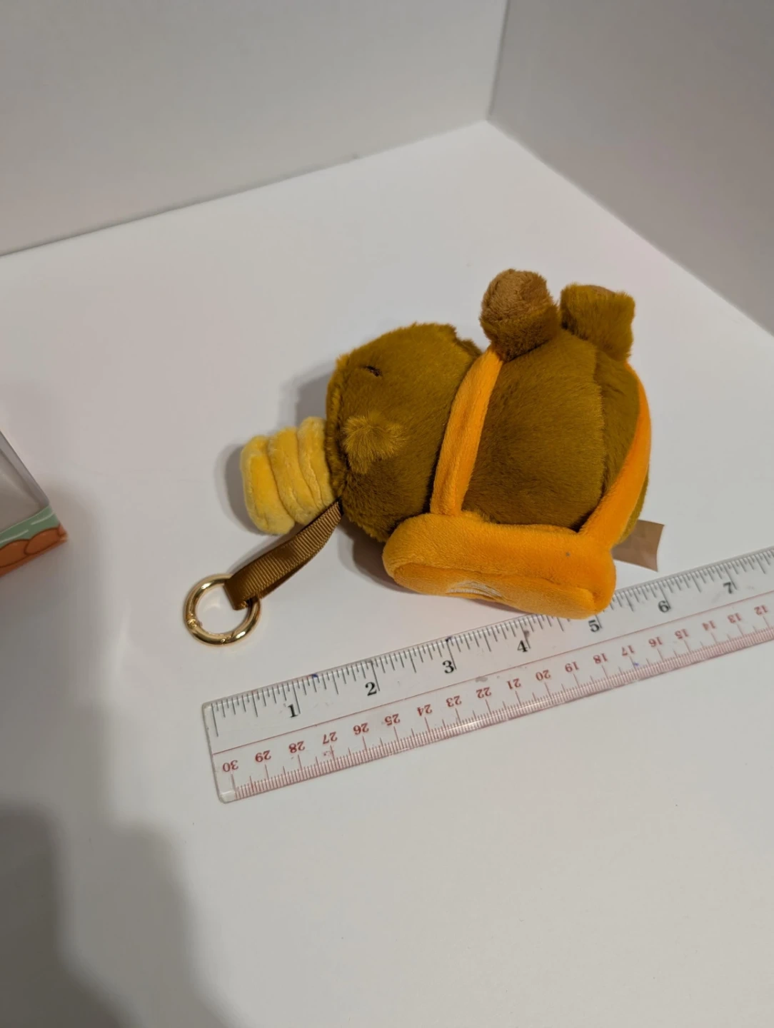 This is a cute capybara plush toy with a keychain attachment. It's soft and comes in its original packaging. The plush is brown with orange accents and a yellow hat-like accessory.