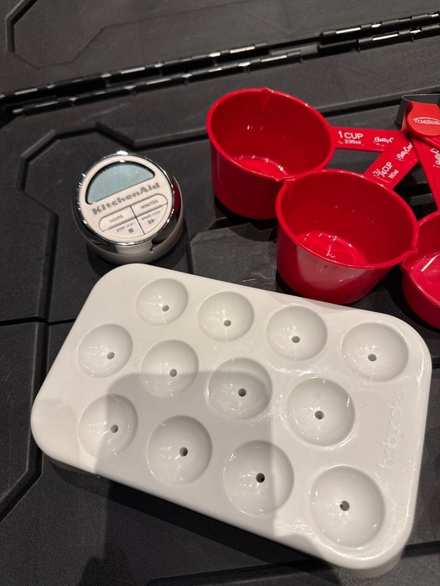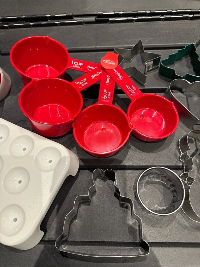 This used KitchenAid baking set includes a digital timer, measuring cups, a cake pop mold, and various cookie cutters. This set is perfect for anyone looking to expand their baking tools for some holiday baking.