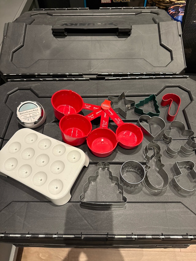This used KitchenAid baking set includes a digital timer, measuring cups, a cake pop mold, and various cookie cutters. This set is perfect for anyone looking to expand their baking tools for some holiday baking.